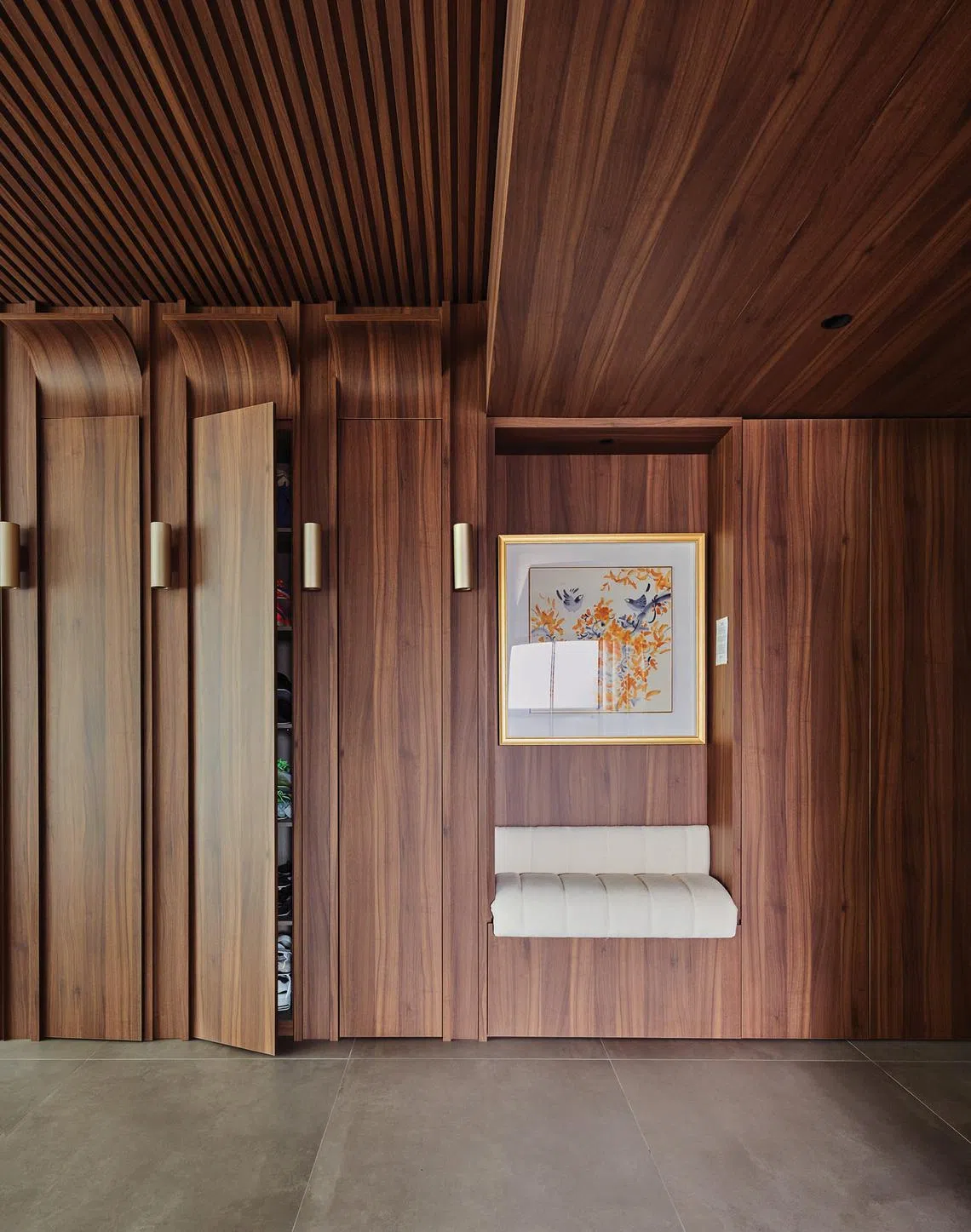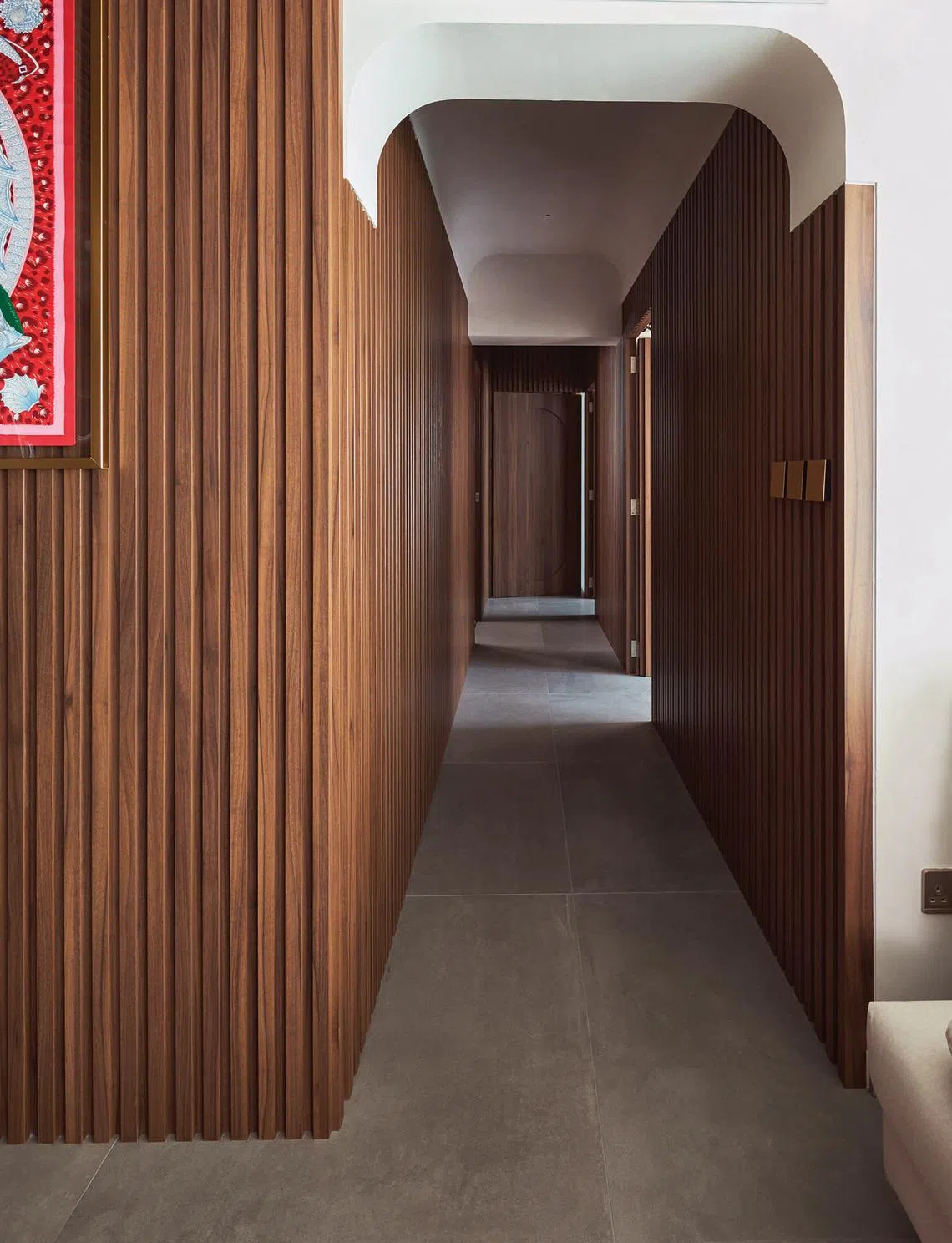 More fluted panels line the corridor leading to the bedrooms, and the bedroom doors are all concealed.