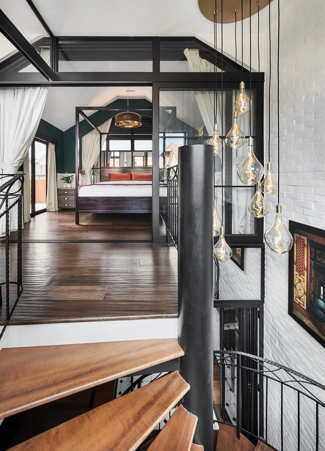 The master bedroom has a pitched roof and ceiling that make it feel like the upper floor of a landed property.