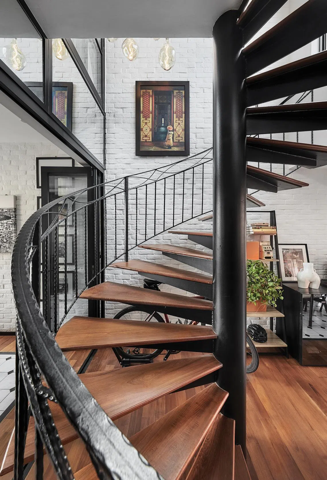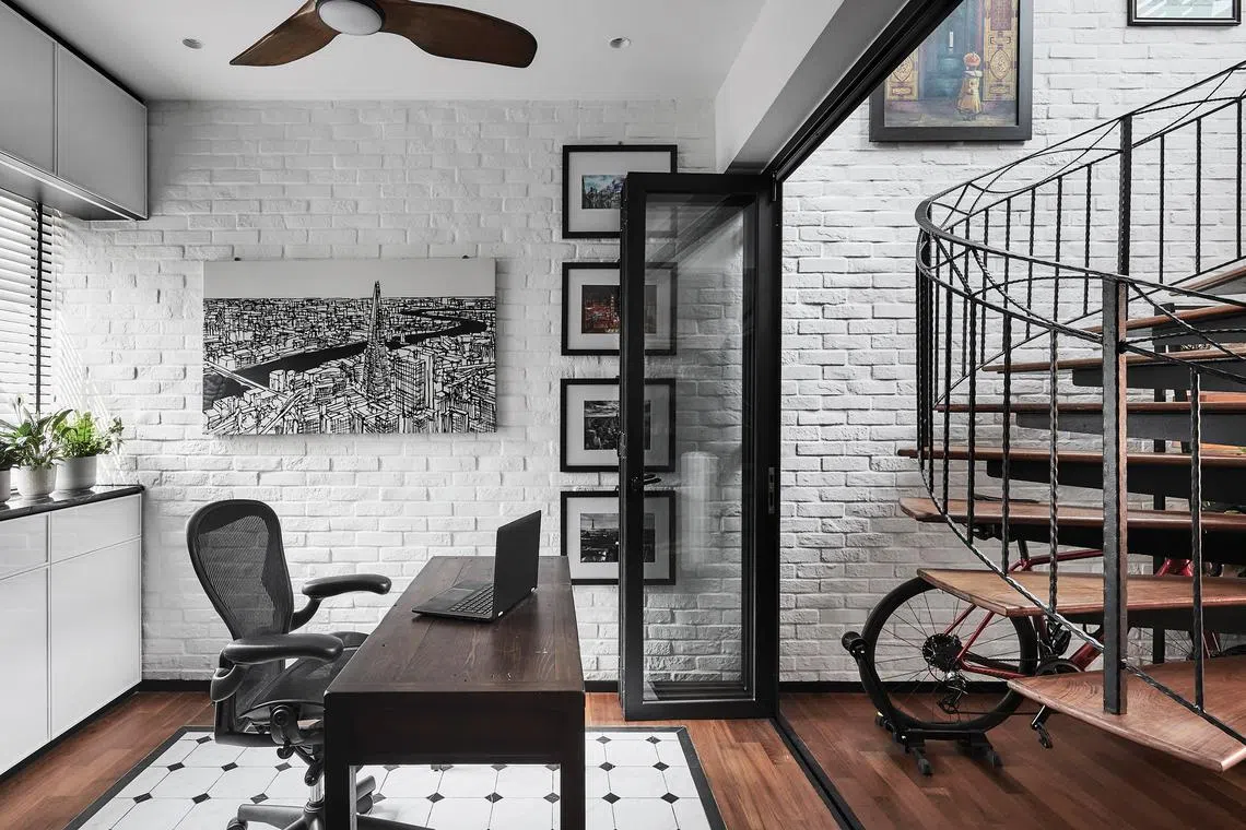 Next to the spiral staircase, a former bedroom is now a study. A whitewashed brick wall extends horizontally from the main entrance and dining room to the study, and vertically up the staircase’s double-volume void.
