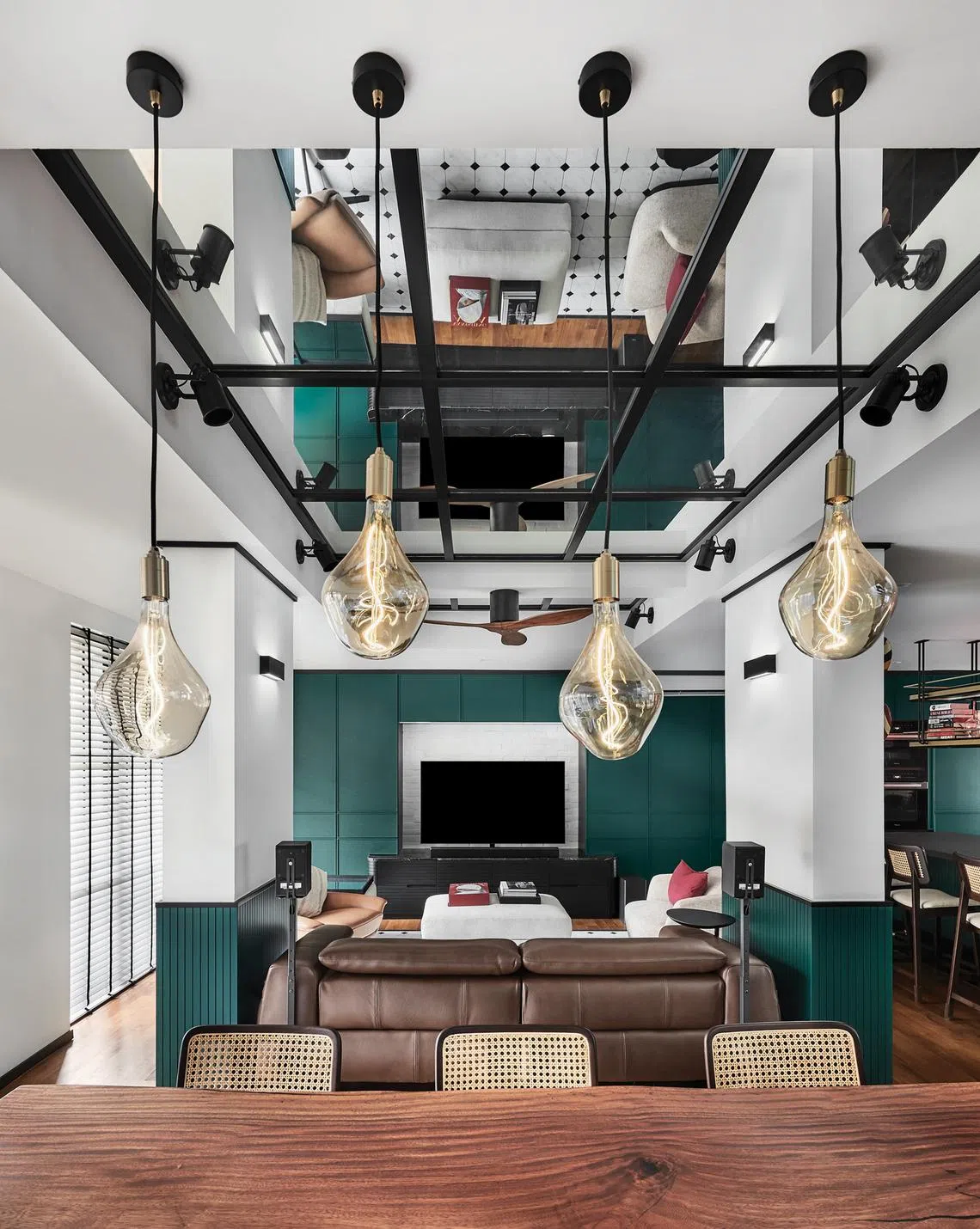 But by introducing a mock column and beam that mirror the existing structures, Mr Puah injected a sense of balance and symmetry into the space, accentuated by inserting mirrored panels on the ceiling between the beams.