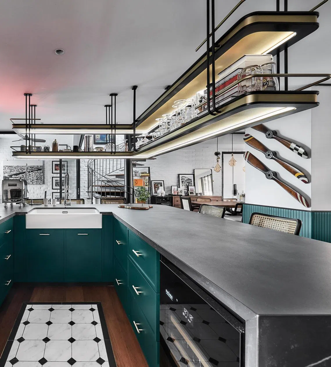 Its cast-iron structure with timber treads, together with the teak wood flooring and patterned tiles on the first level, instantly transport the viewer to New York’s lofts and London’s walk-up apartments.