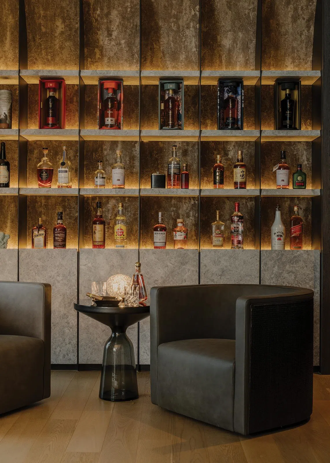 As a whisky lover, the husband wanted a dedicated area to house his collection and to enjoy it with guests. The showpiece of the bar is a whisky display cabinet with natural stone doors and shelving, and bronze metal plate dividers. A backdrop of special textured wallpaper from Arte echoes the stone’s natural grain.