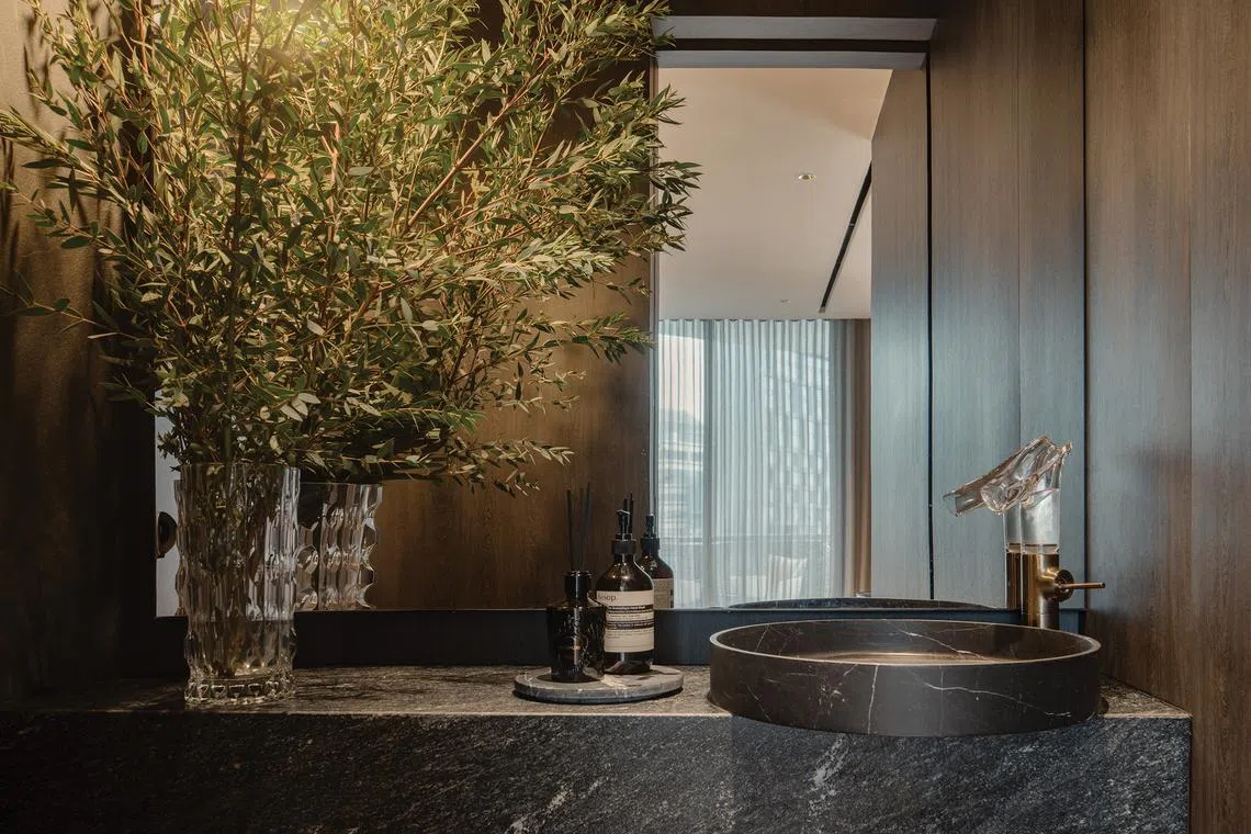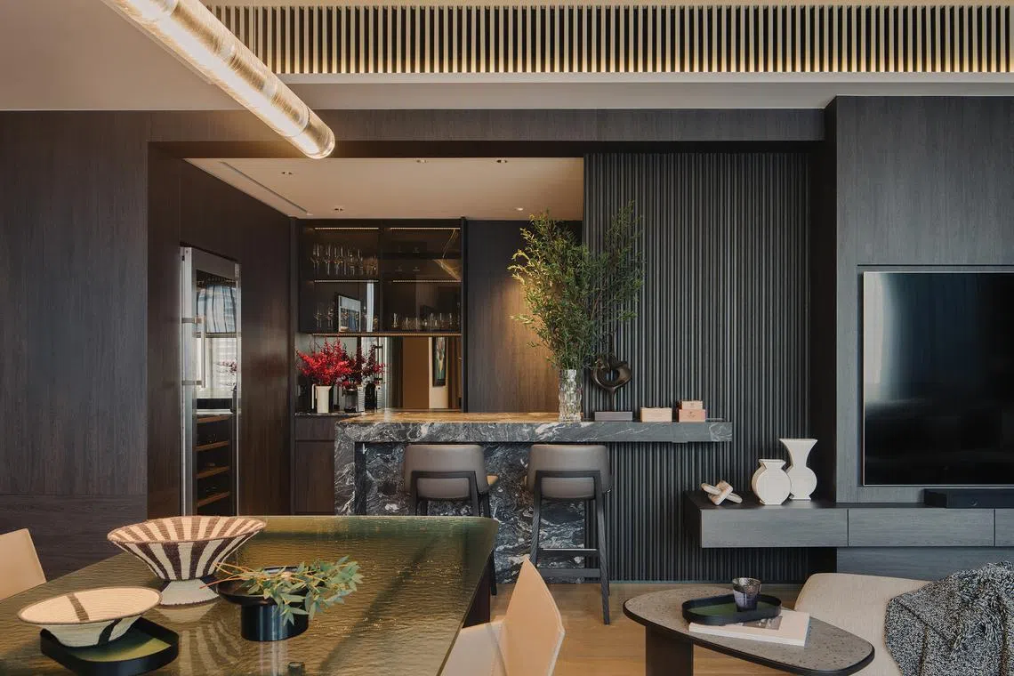 The dry kitchen, which faces the dining area, is defined by a peninsula island built with Forest Black stone in an antique brush finish. Black-timber fluted wall panels conceal the household shelter at the back, and a bronze-tinted mirrored backdrop reflects the city view.
