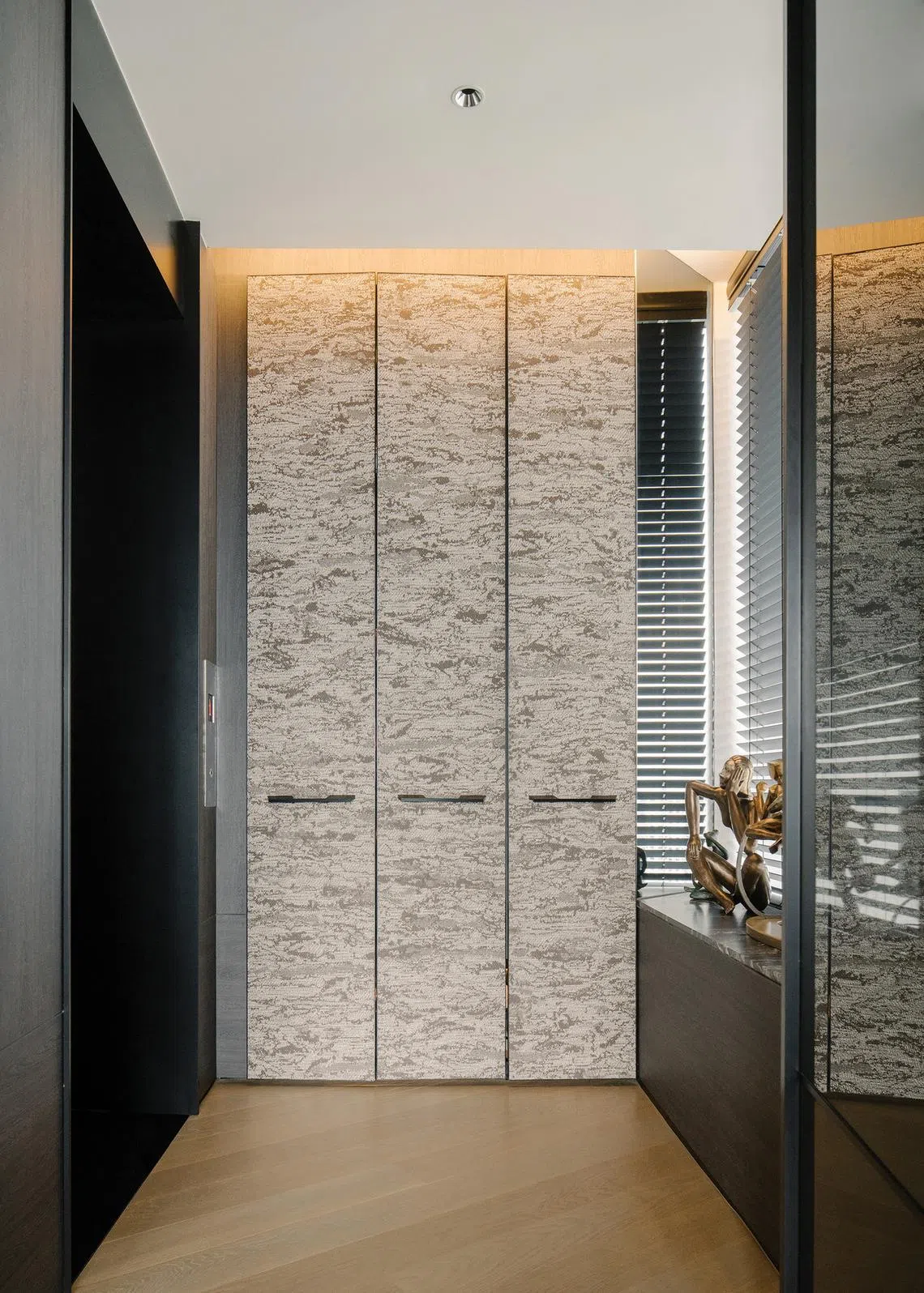 The apartment’s lift opens into a private foyer, where everyday items such as shoes are concealed behind textured fabric wall panels.