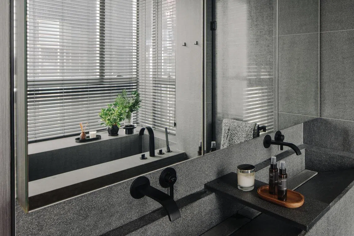 For the master bathroom, the couple requested a granite stone bath similar to the one in Aman hotel in Tokyo. Ms Tan had one custom-made, framed on three sides by full-length glass windows, to transport the couple back to the Japanese onsen that they fell in love with on their travels.