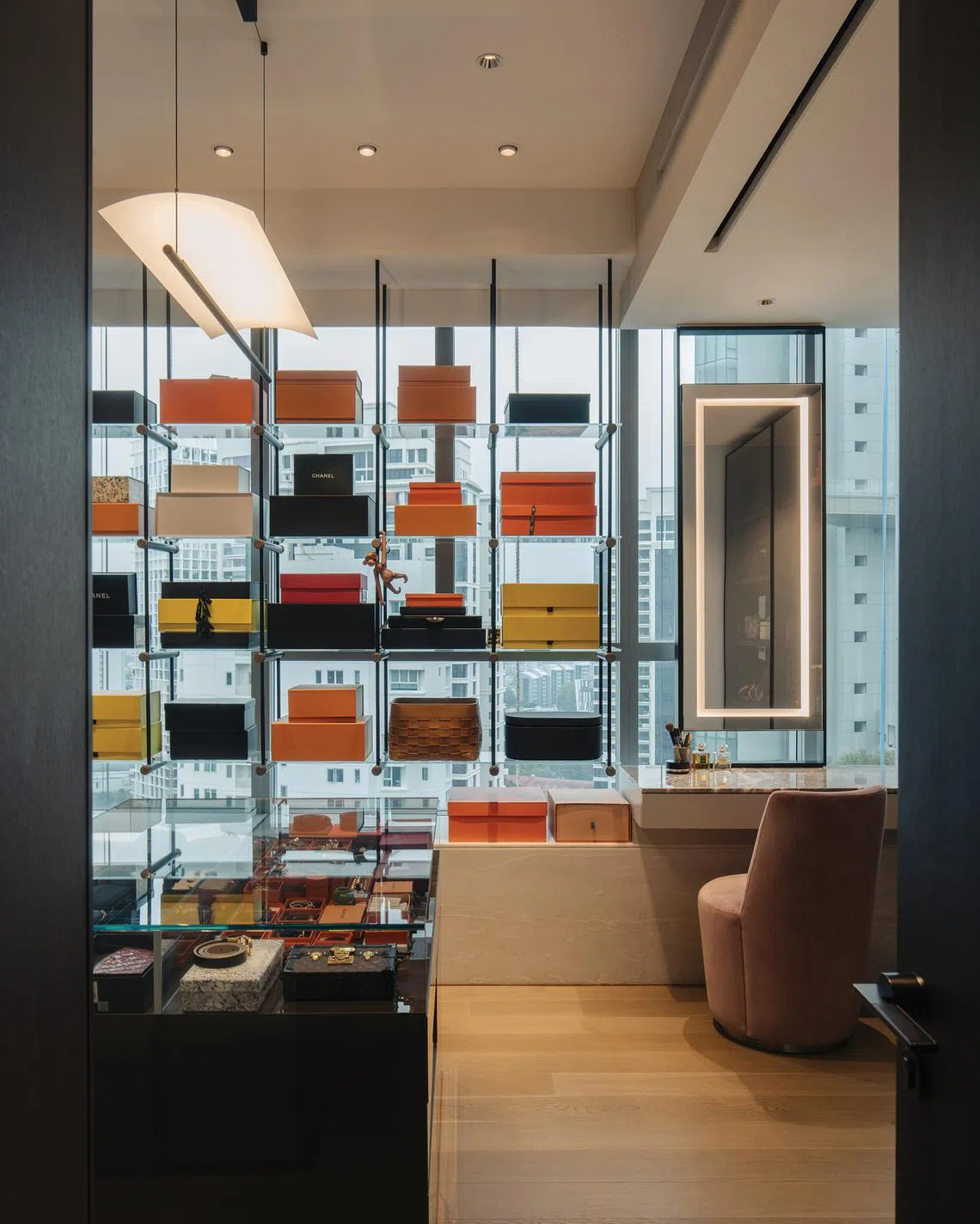 One of the remaining two bedrooms has been converted into a walk-in wardrobe for the wife. A Rimadesio island from their former home has been integrated into the new space, with suspended display shelves along the bay window.