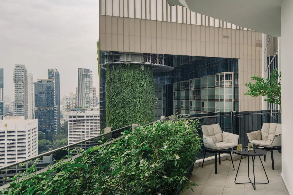 Complementing this indoor bar is an outdoor area on the balcony, which is furnished with two Husk outdoor swivel chairs from B&B Italia and offers a sweeping view of the city skyline.