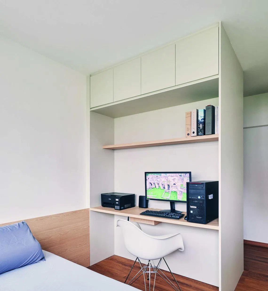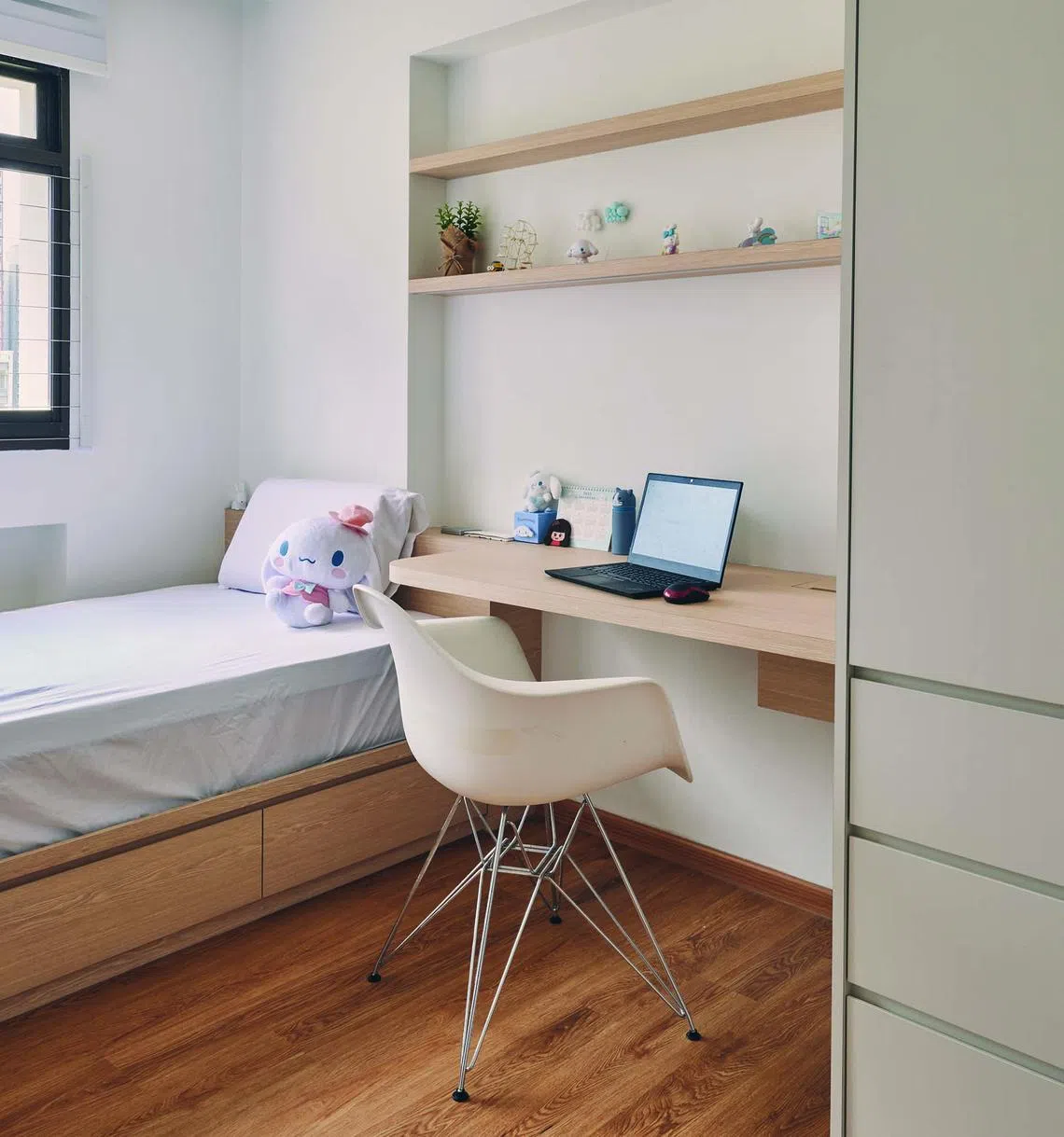 Mr Wong moved the walls between rooms and the common corridor to make space for storage. Both kids’ rooms feature a platform bed frame with drawers and compartments, and a custom study and wardrobe with storage compartments in various sizes.
