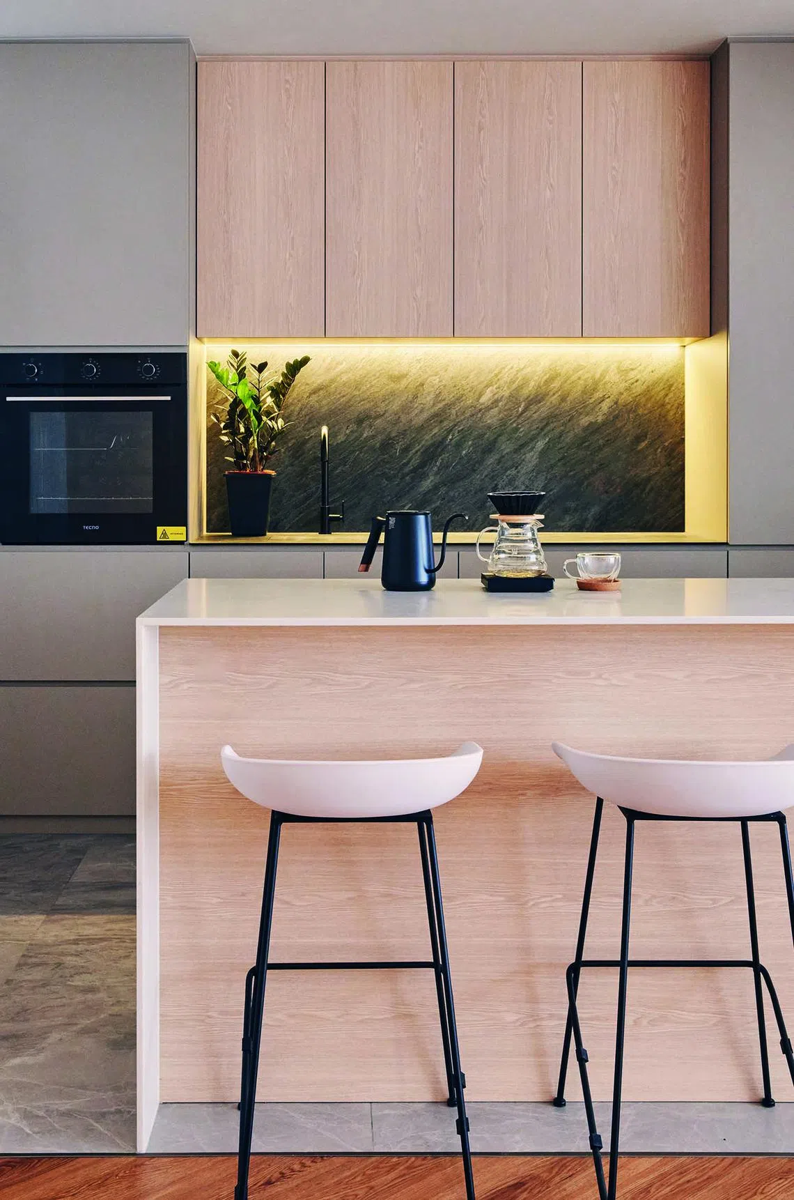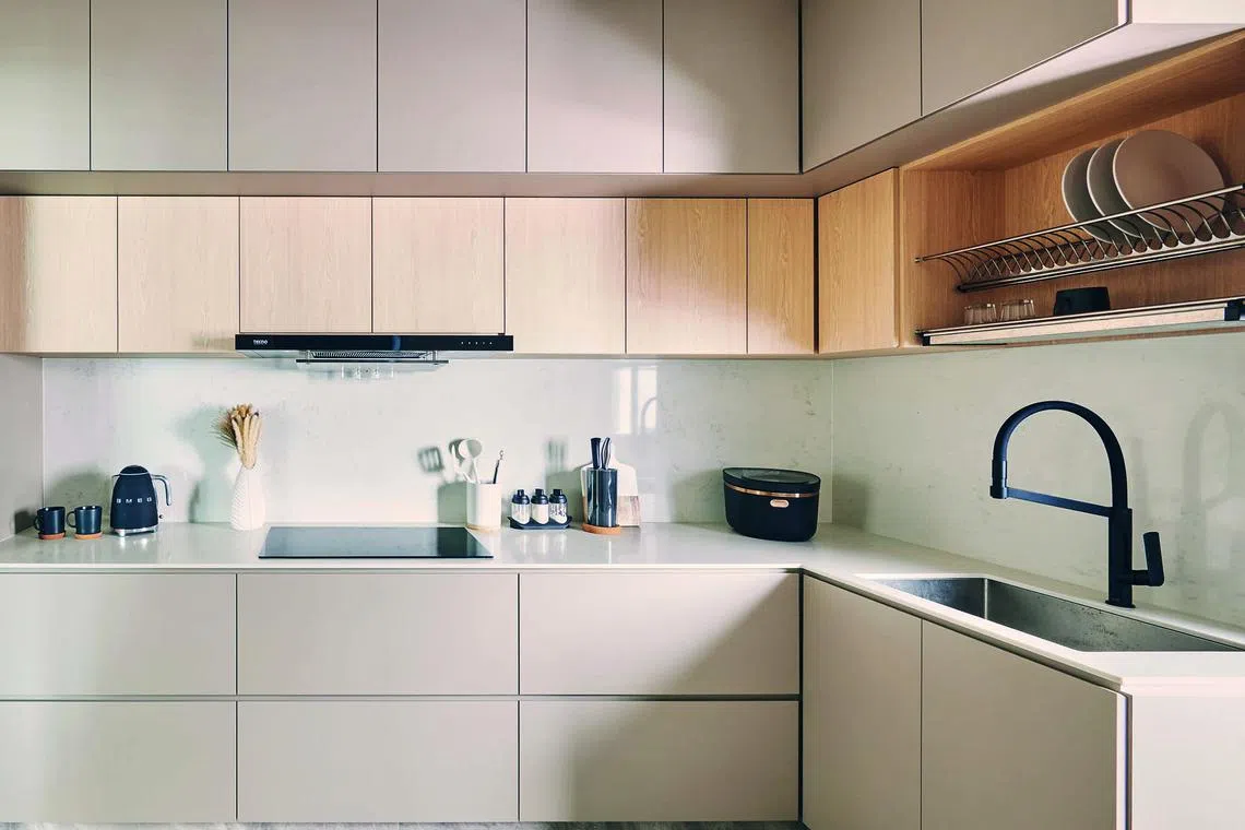 Both kitchens feature 80 by 80cm marble-look tiles from tile specialist Lian Seng Hin and neutral carpentry with pull-out mechanisms for easy access.