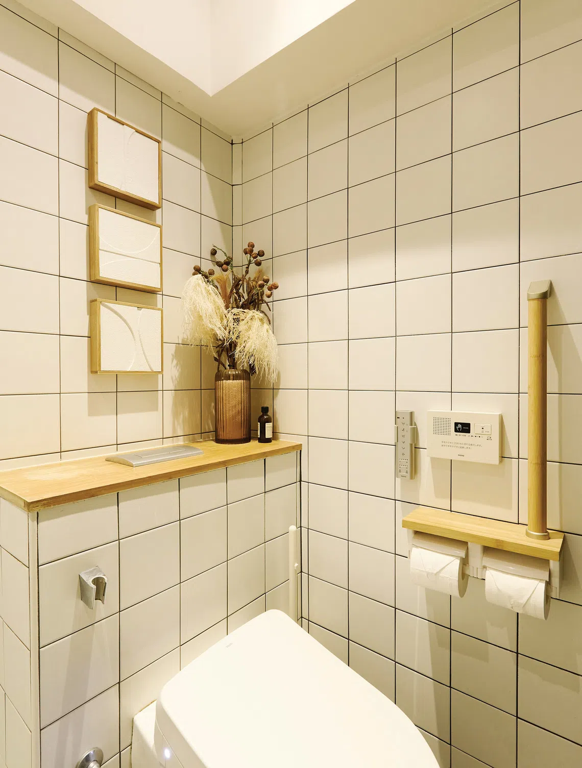 The common bathroom, decked out in a Japanese-Scandinavian style, stands in stark contrast to this with its white wall tiles and simple decor.