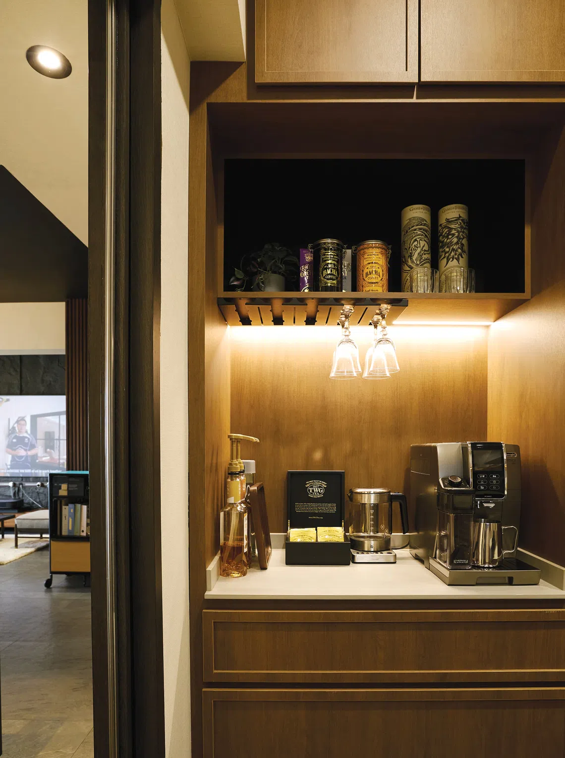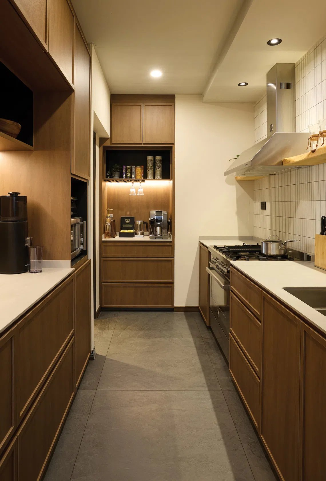 In the kitchen, wooden cabinetry, light stone, stainless-steel appliances and a white subway-tile backsplash combine to reinforce the modern Japanese theme. There is also a pantry nook, where the couple can prepare coffee, tea and other beverages.