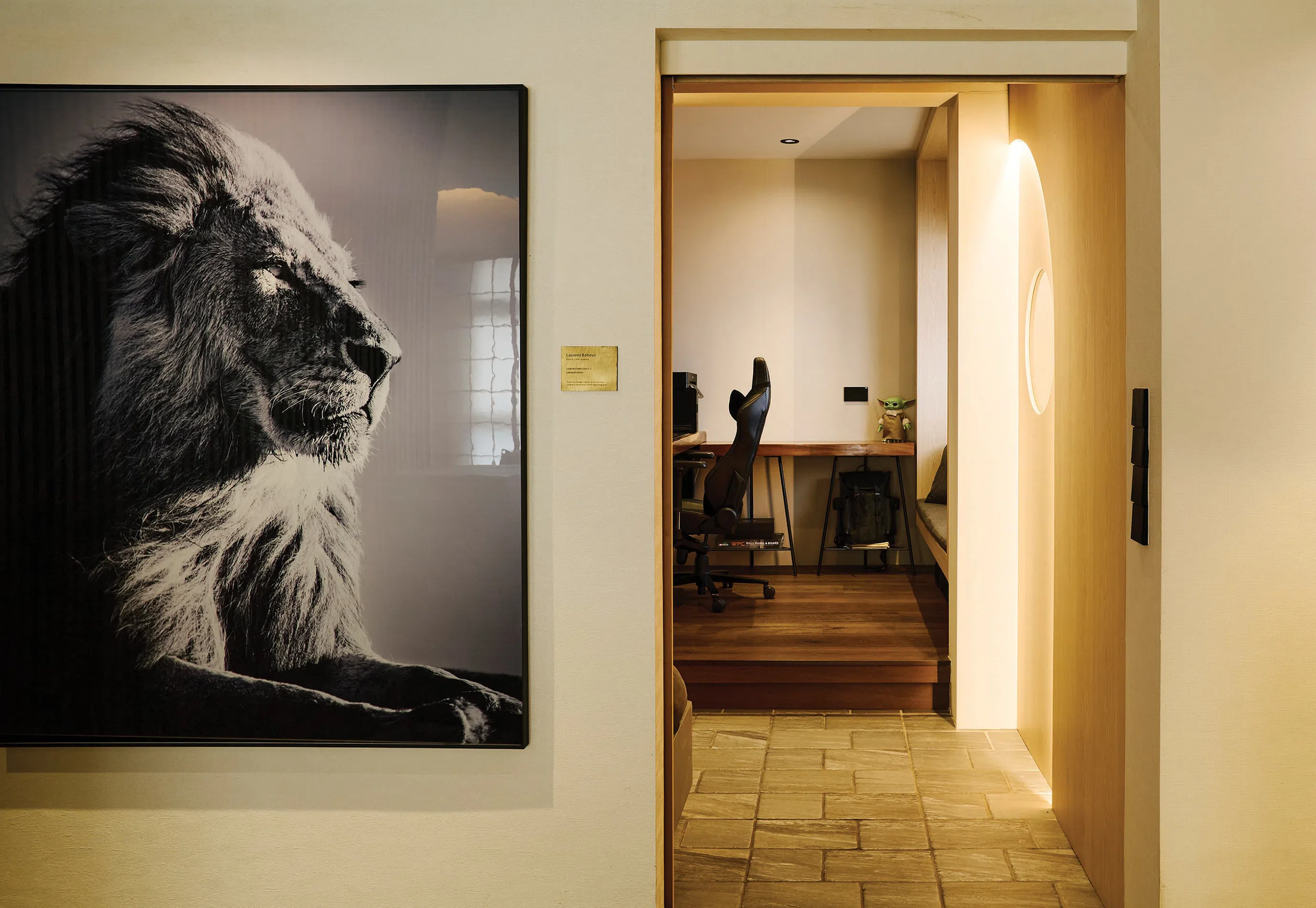 Clean lines, natural materials and warm lighting in the foyer.