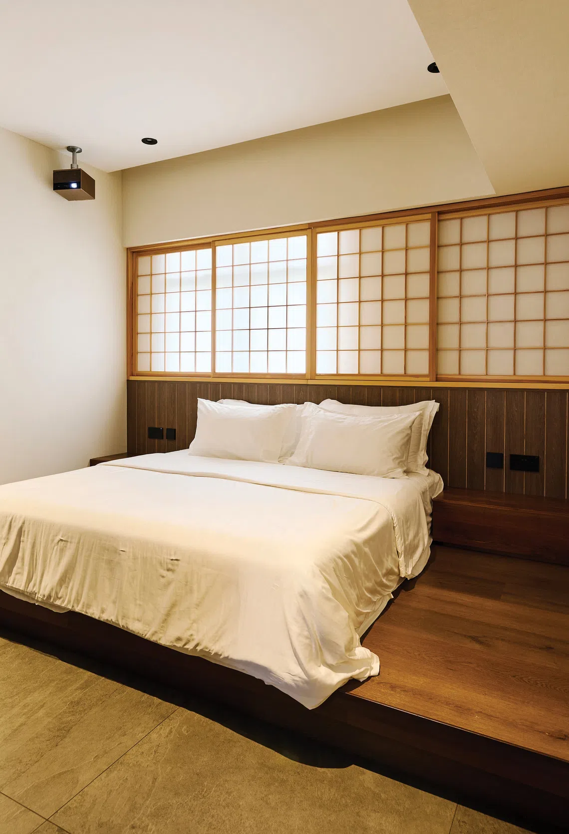 With its platform bed and shoji screen, the master bedroom feels like a traditional Japanese inn.