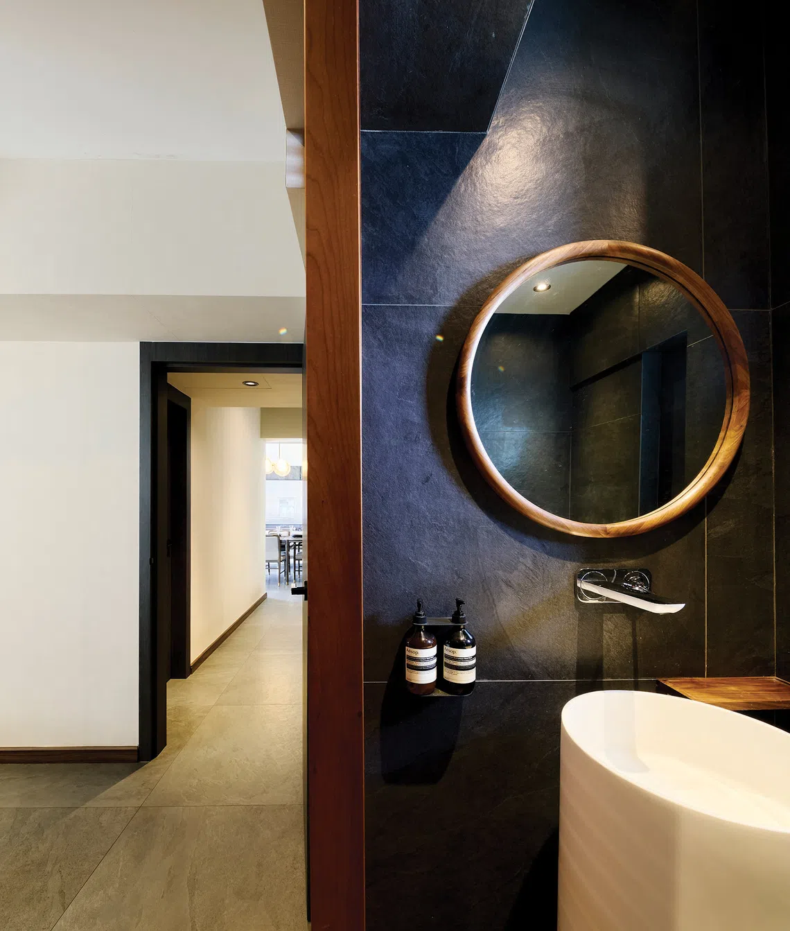 The master bathroom has a spa-like ambience that instils calm in its users. Here, bold materials are combined with elegant details, such as with the cylindrical white pedestal basin and warm wood-framed mirror, set against a dark matt backdrop.