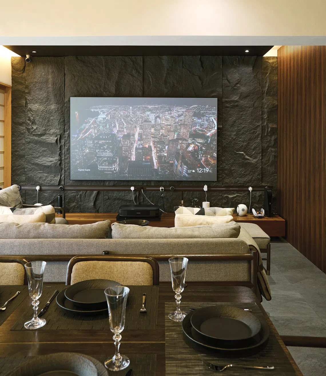 The television wall is clad with textured stone for an organic touch.