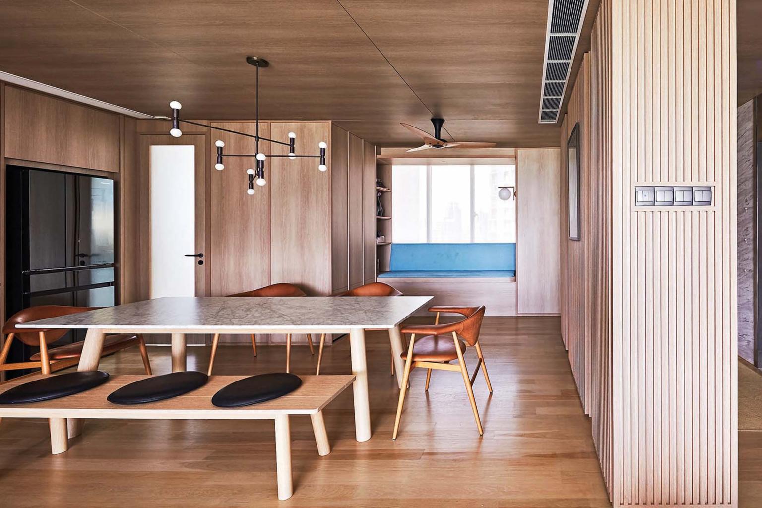 Most of the apartment's original layout and flooring were preserved, but the dining area underwent extensive renovations. The dry kitchen was removed and the freed-up space is now part of a larger dining area that is the centre of the home. There is a mini pantry on one side and a reading corner created from a built-in bay sofa seat.