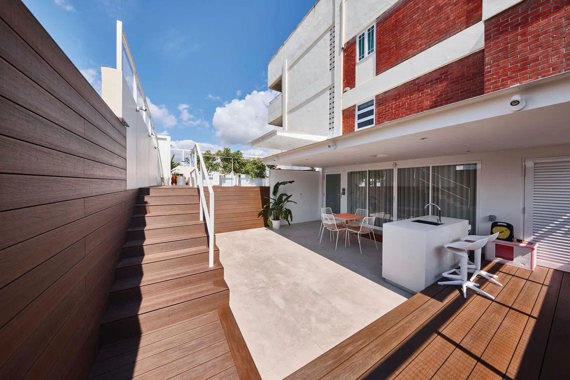 The master bedroom is at the end of the corridor, next to the outdoor terraces. It opens out to an outdoor lower patio with a new pantry and sink, where Mr and Mrs Ling have breakfast.