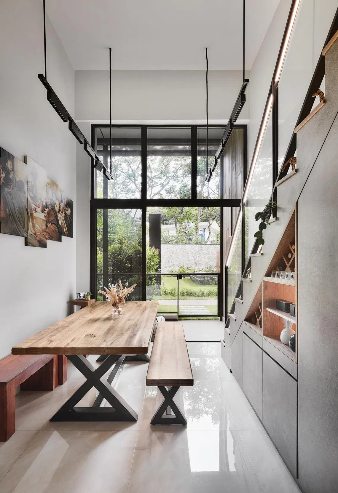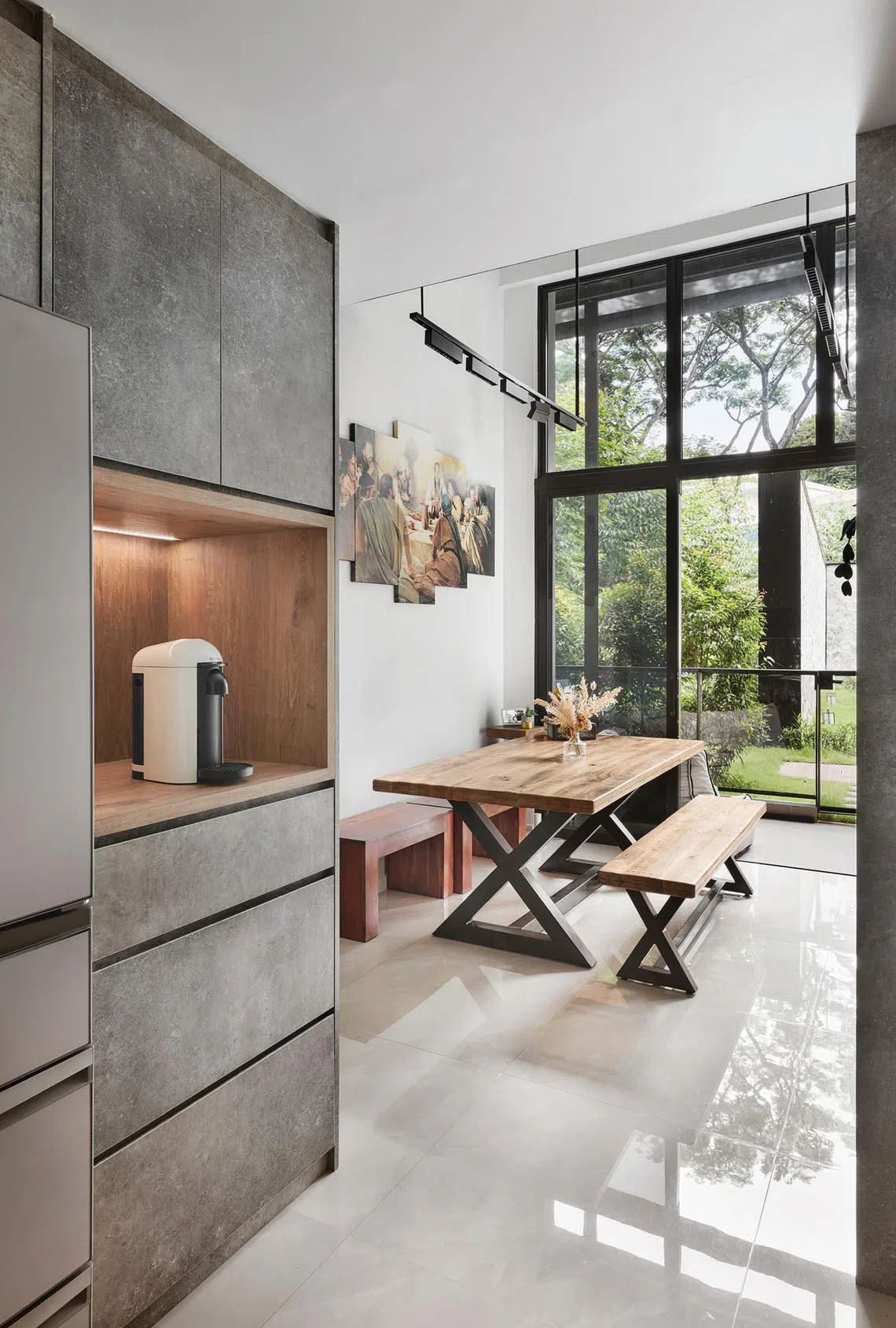 The industrial-themed home has elements of wood to soften the overall look and feel. Although Ms Bak opted for a grey laminate that resembles natural stone, especially in the pantry and staircase storage, she says industrial style does not have to be stark and grey.