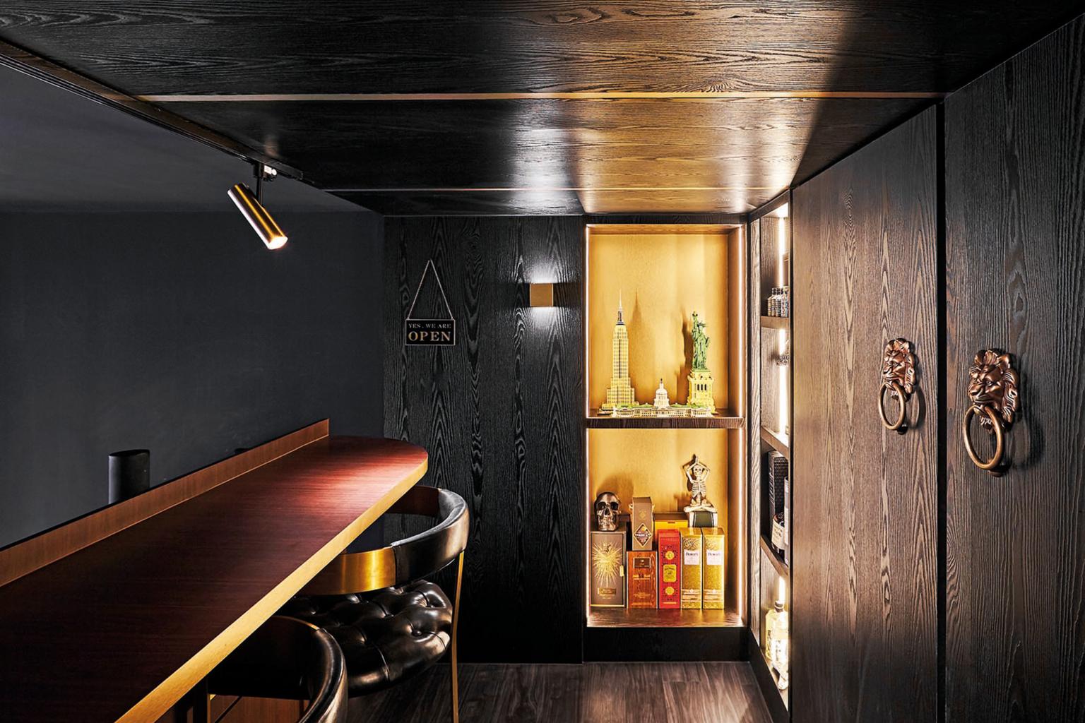 The dark walnut tones and discreet gold accents resemble the palette of the award-winning Manhattan Bar in Regent Hotel.
