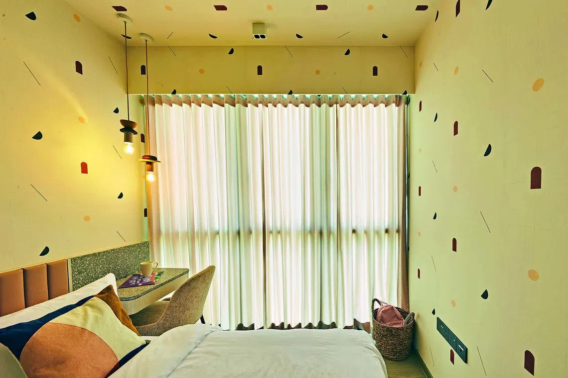 The desk and headboard in the daughter’s room are made of terrazzo slabs from KStone, with the former doubling as a nightstand, with child-friendly rounded corners. For a pop of colour, Ms Hun added peachy pink accents and geometric wallpaper from wall-covering shop Tat Ming.