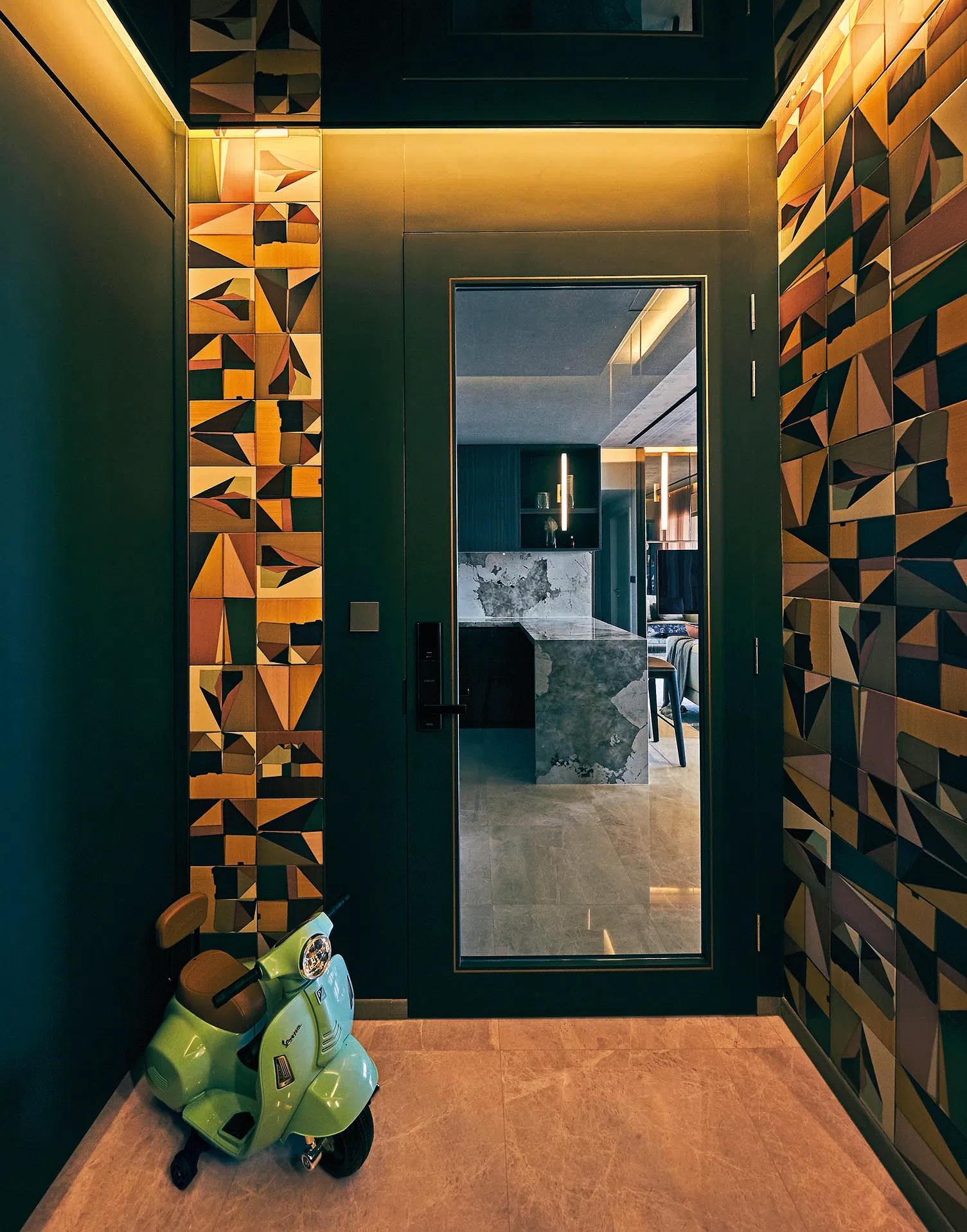 Decorative geometric tiles and a miniature Vespa lend playfulness to the entrance.