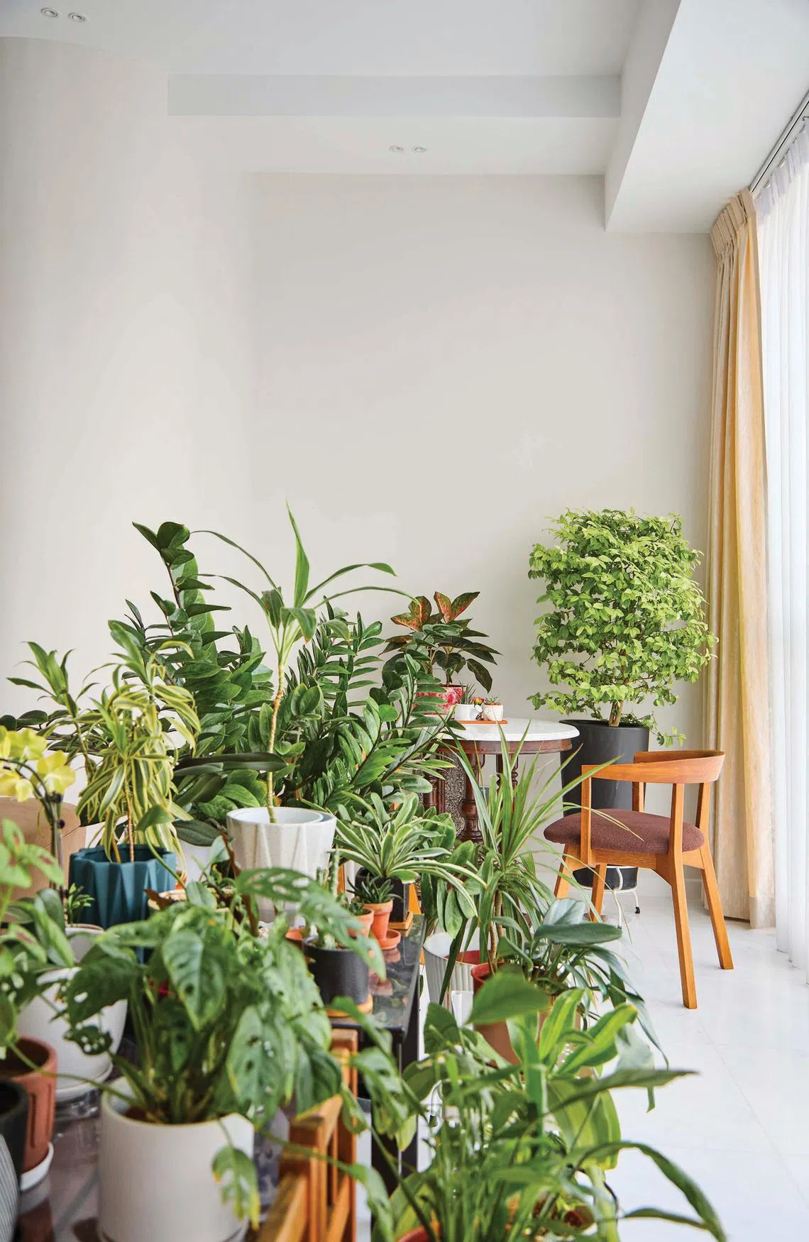 An indoor garden serves as a lush haven for the couple’s long-lived botanical companions, some of which have been with them for over 30 years.