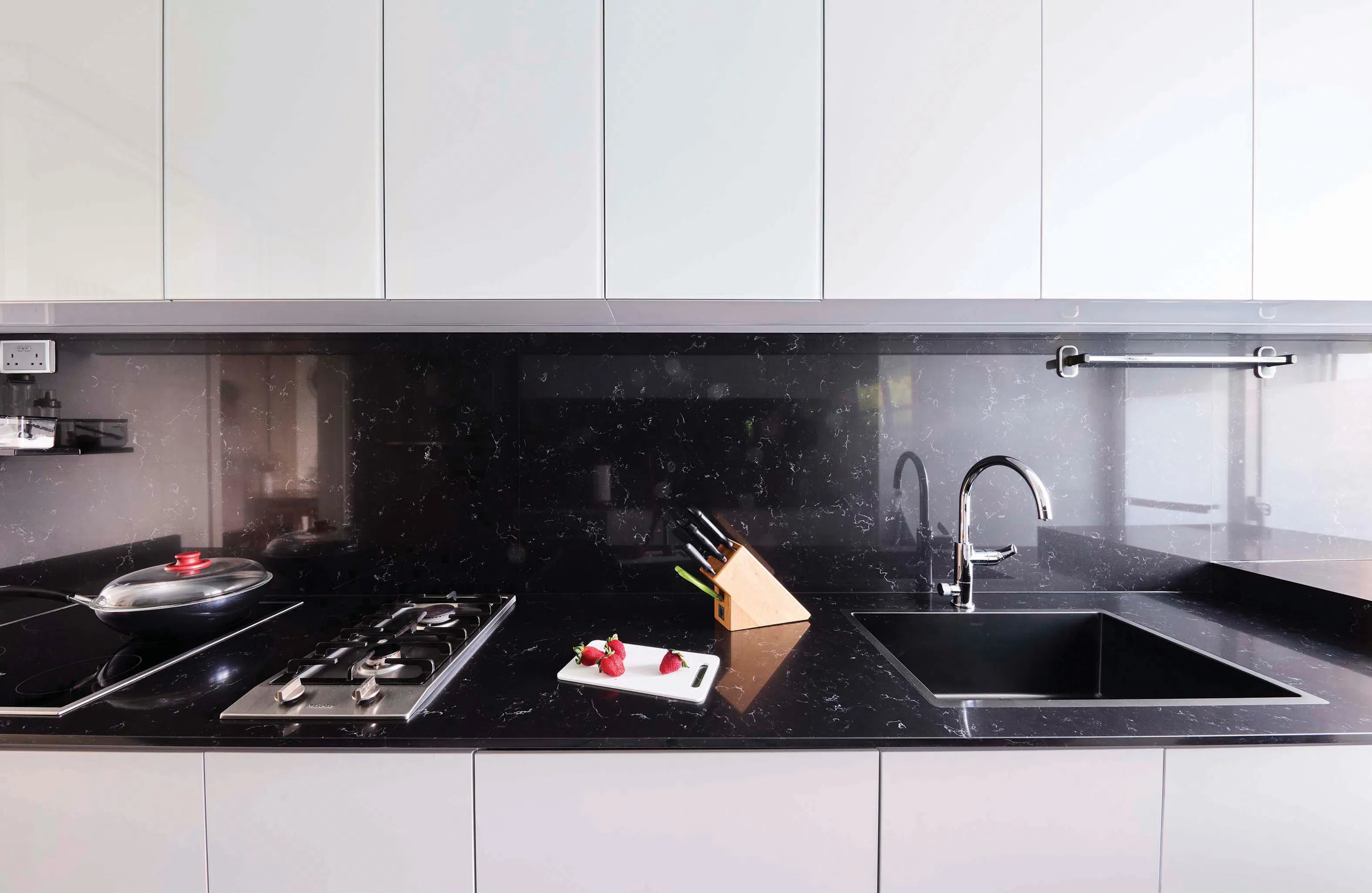 The wet kitchen has durable black quartz worktops and white glass cabinets.