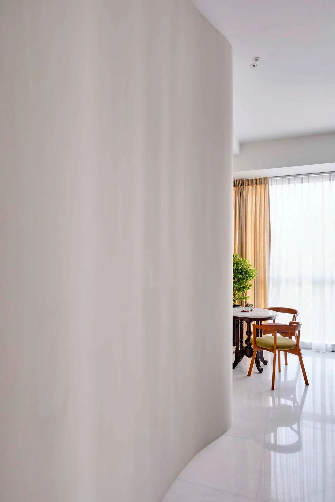 A graceful curved wall delineates the galley kitchen and living area. Adjacent to it is a breakfast nook with a vintage marble table, which the couple spent days restoring.