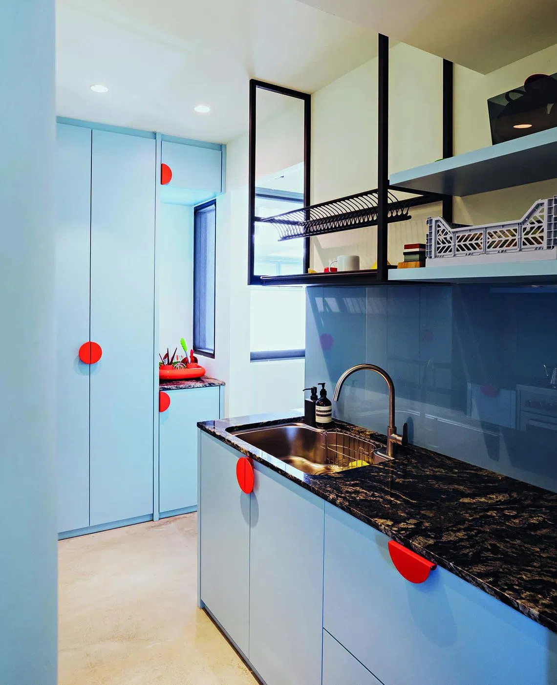 After exploring a few colour schemes for the kitchen, the design team selected light blue laminates, with bright orange semicircle handles sourced from Ikea, as well as glossy black granite countertops.