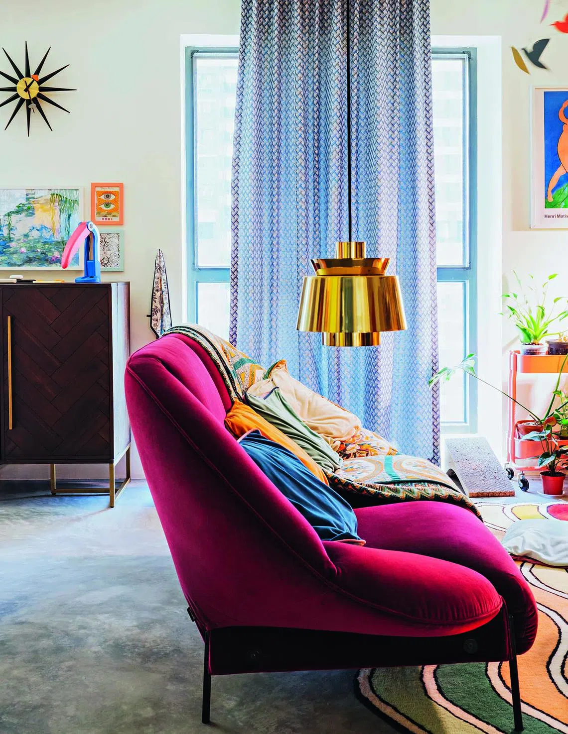 A velvet red Paipai sofa from Ligne Roset anchors the living area.