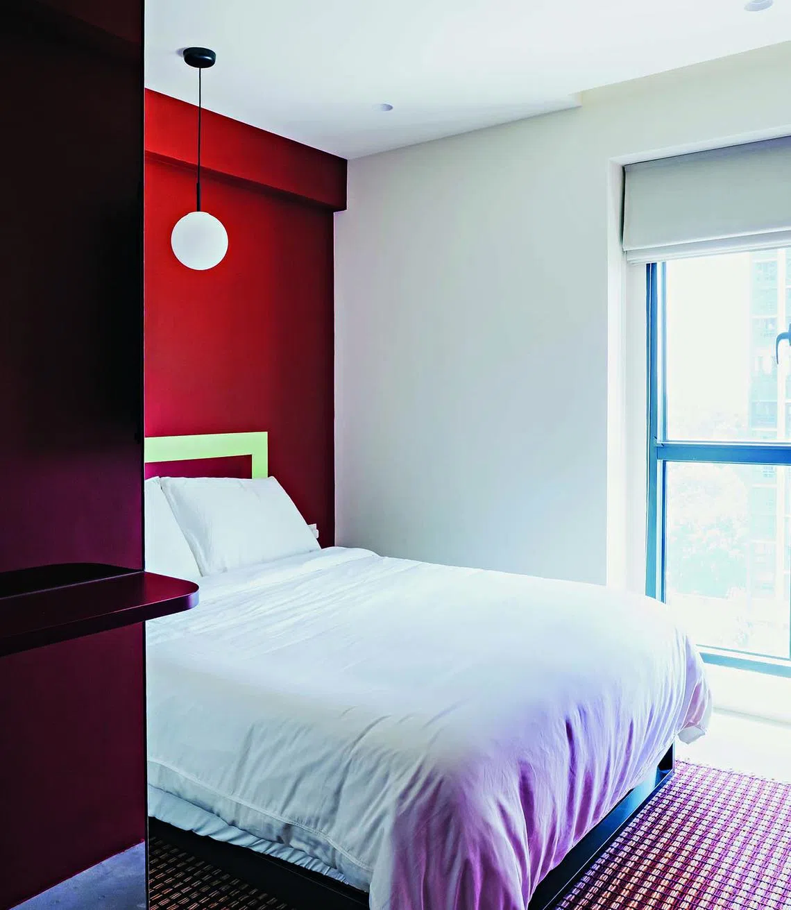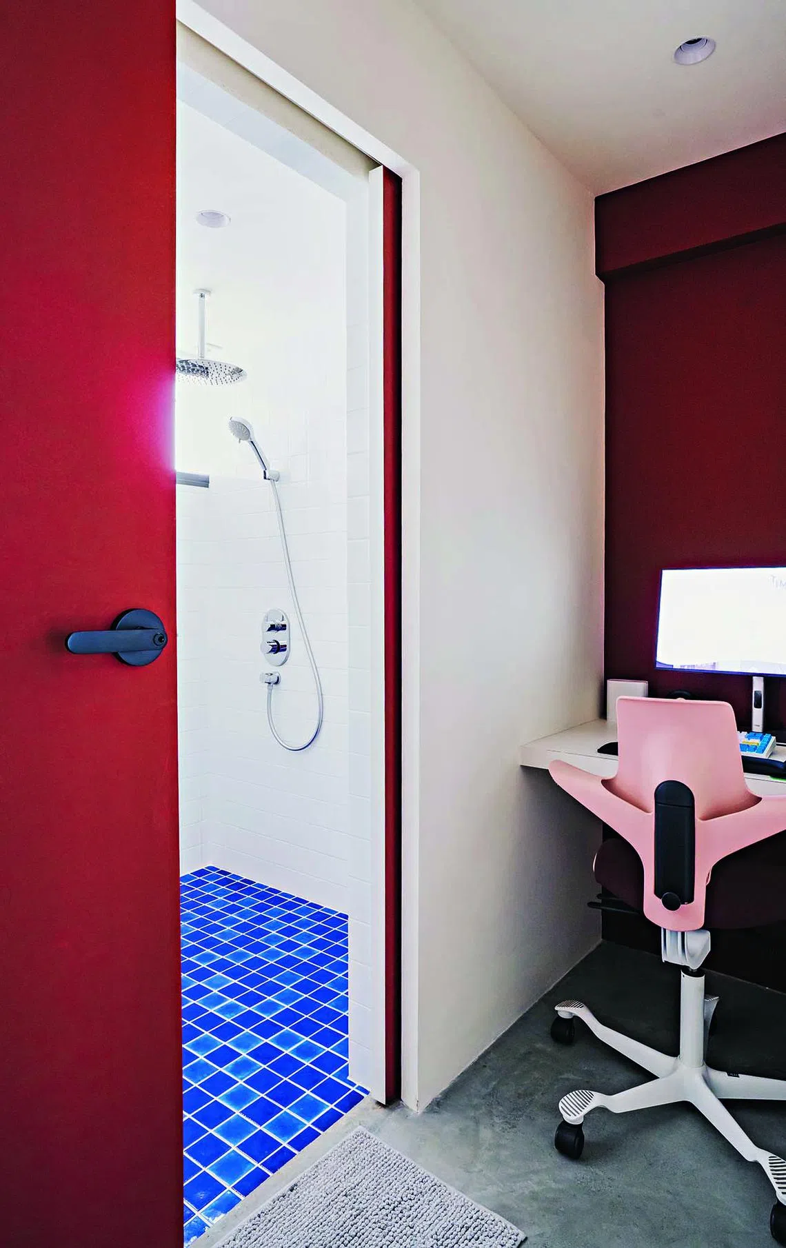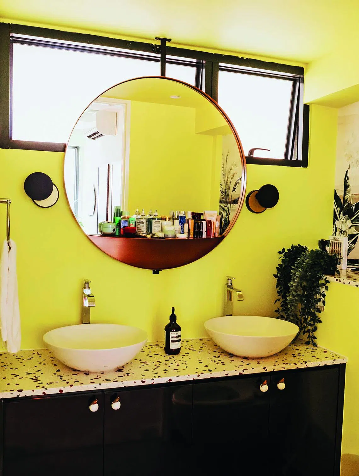 Like the shared spaces, the bathrooms and bedroom are awash in colour: sunny yellow for the powder room and red for the master bedroom.