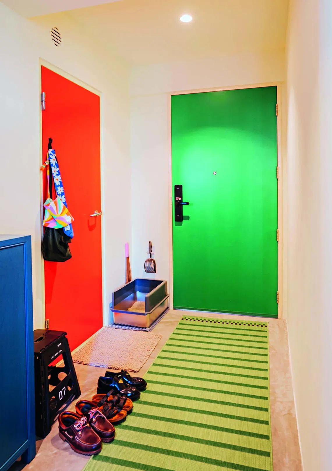 The foyer, with the viridian green main door and orange household shelter door, gives visitors to the flat a taste of what is to come. Cement screed flooring serves as a neutral, yet visually textured, base.