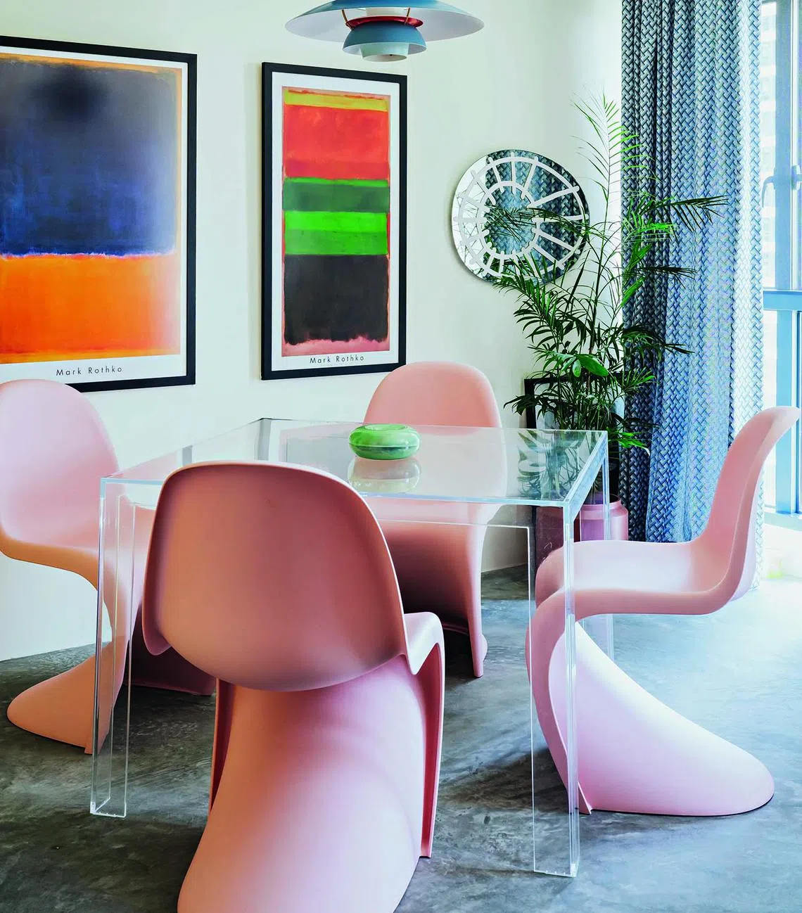 The Invisible table from Kartell complements the pink Panton chairs from Vitra and creates a sense of space in the dining area.