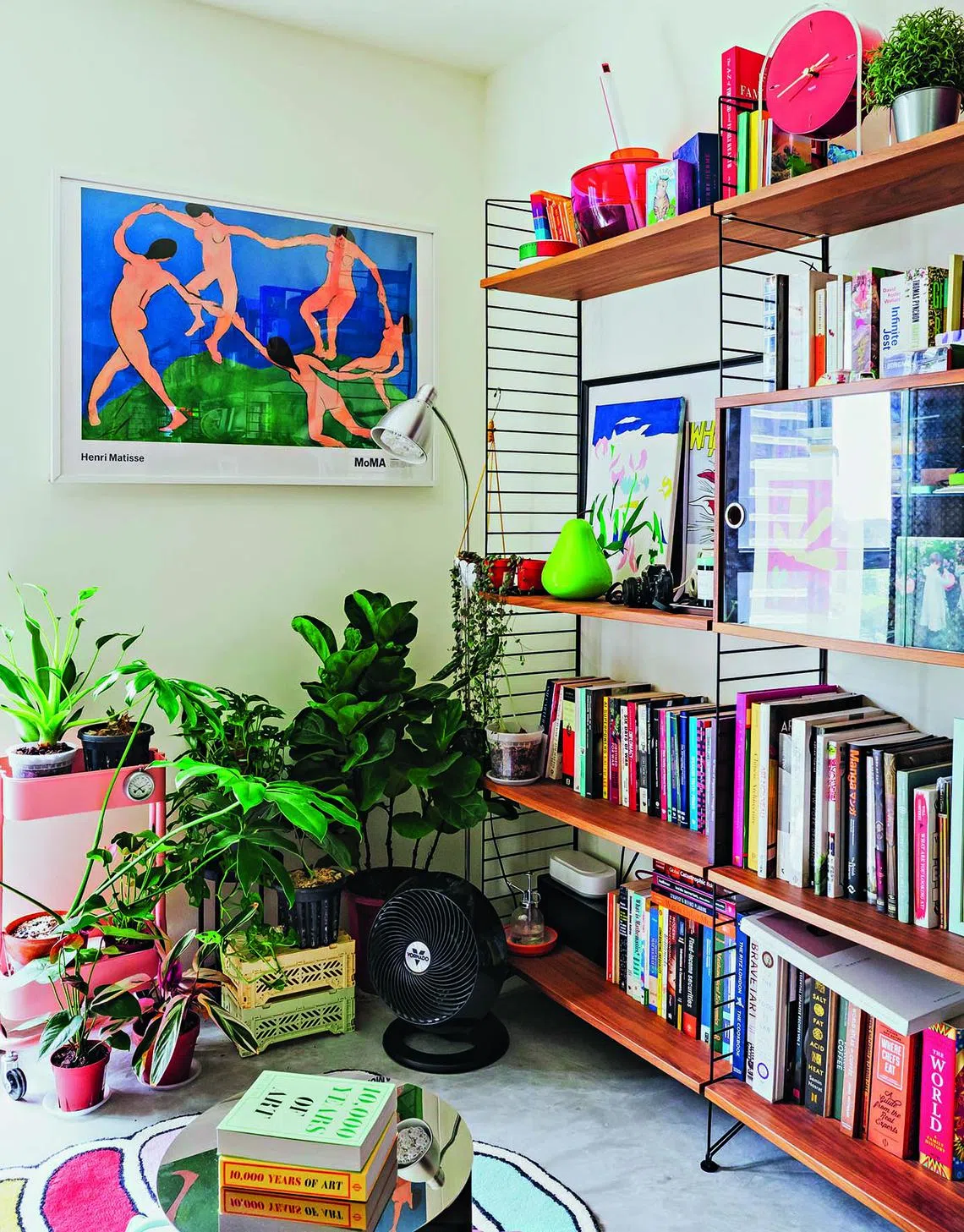 This also freed up space for their collection of art, plants, books and vinyl records, which is primarily housed on the String shelves in the living area.
