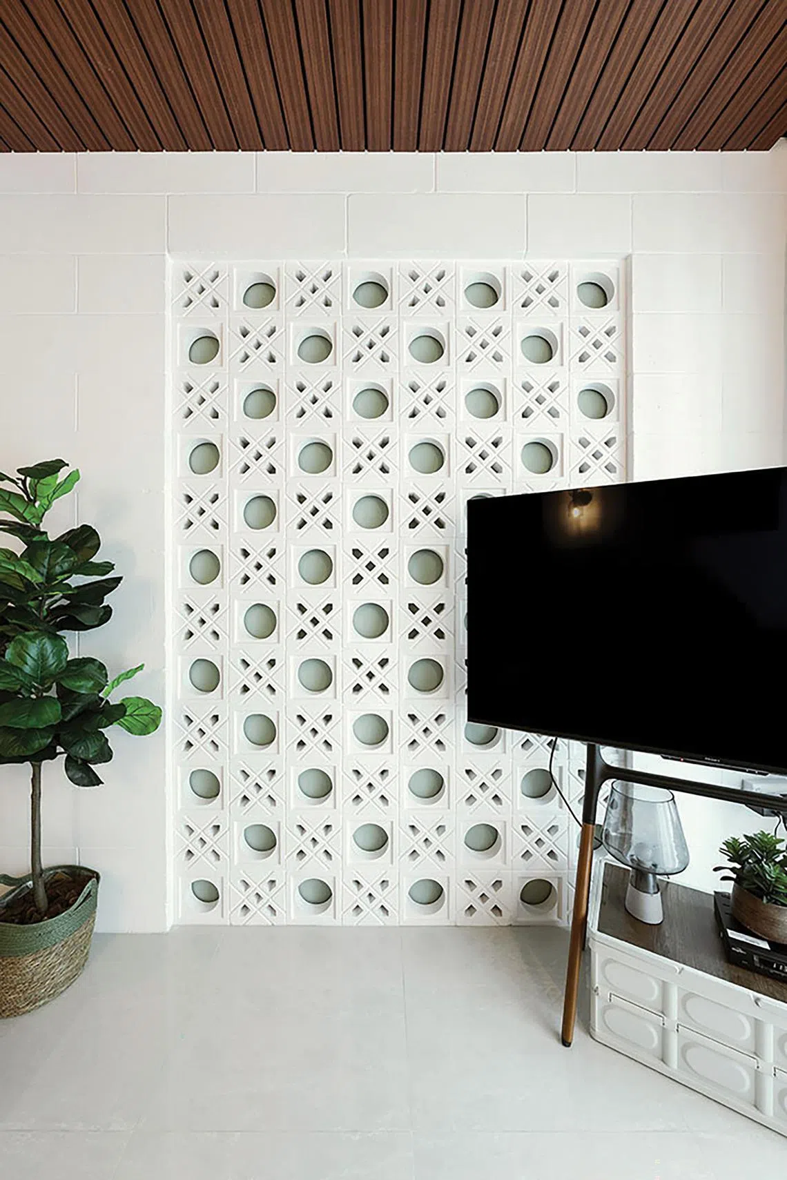 In the living area, muted green makes a subtle appearance behind the breeze blocks. Hollow blocks create a frame, while wooden slats clad the ceiling to demarcate the living area while anchoring the space visually.