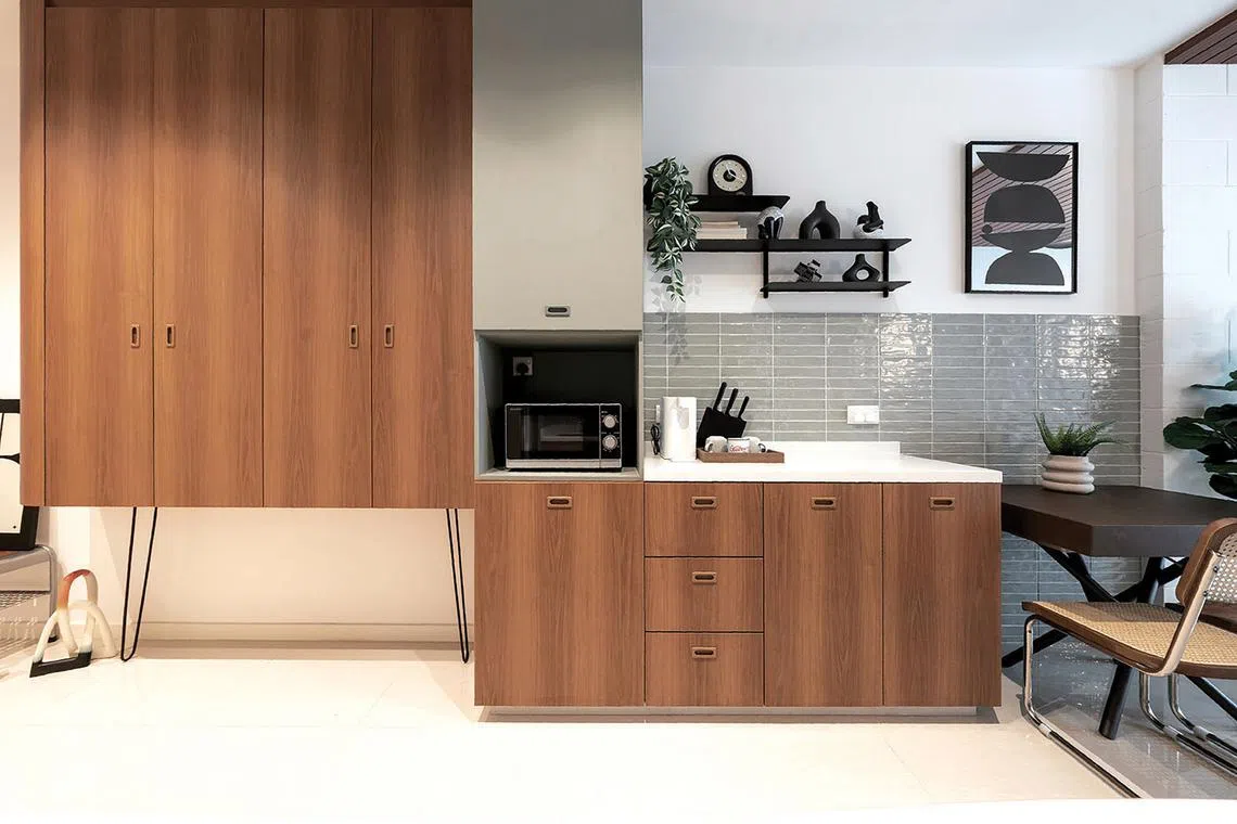 One of the owner’s main concerns was the small kitchenette. Ms Tang had storage cabinets built on the opposite wall to create a galley kitchen, giving the owner more countertop space for cooking.