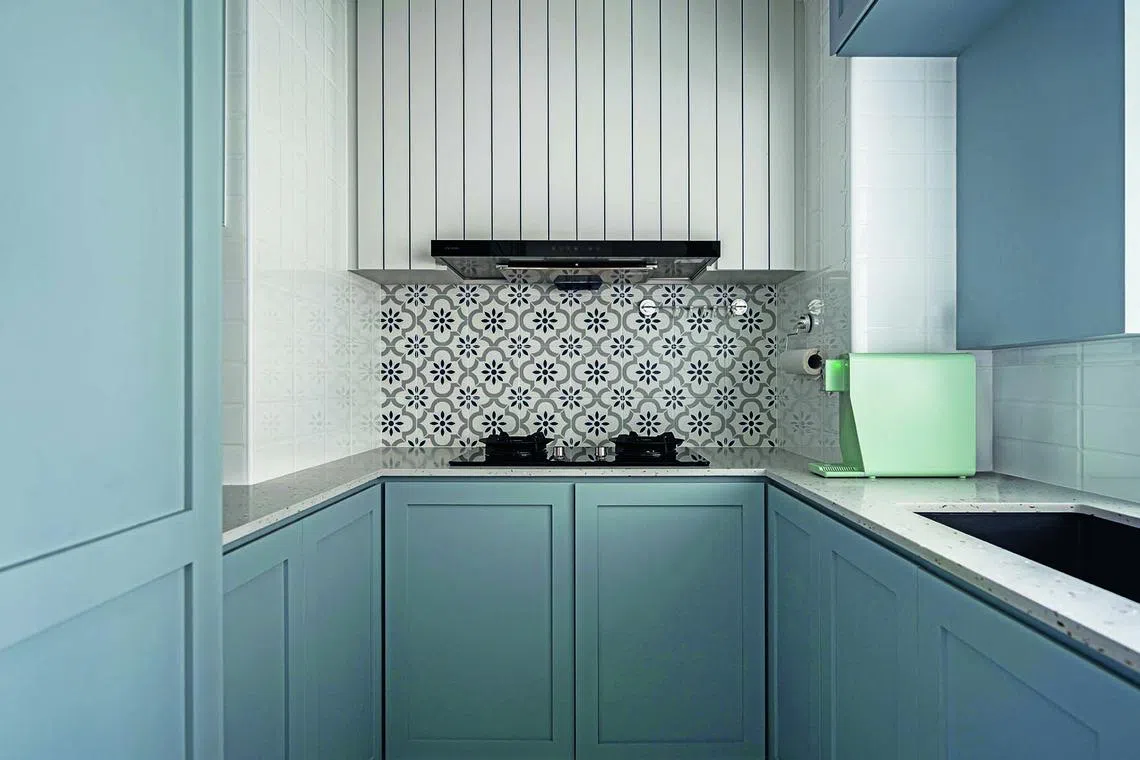 The designers overhauled the black-and-white kitchen into a serene space in light blue. Decking the cooking area out in patterned backsplash and shiplap details creates a focal point.