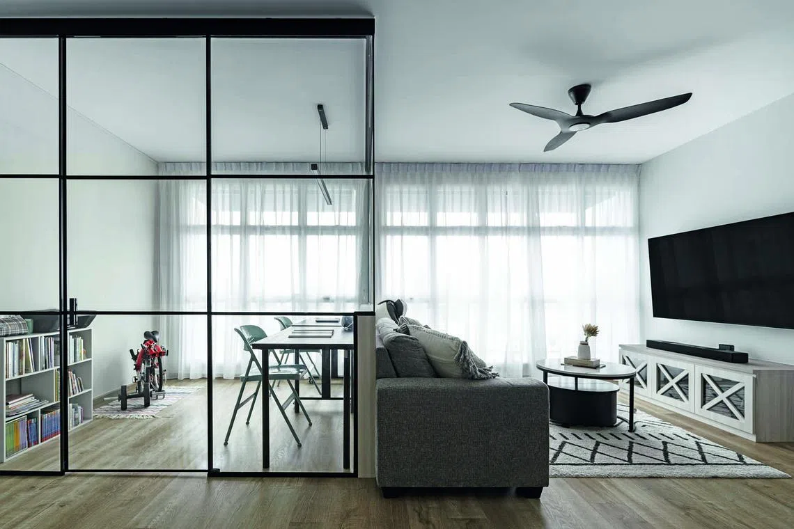 The owners, two civil servants in their 30s with two children, wanted to be able to work and entertain in their new flat, which also has a view of the Singapore Flyer.