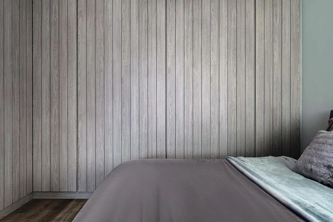 The couple got rid of the dark furniture in the old master bedroom. The new version is more streamlined and decked out in matt wood grain. A long wardrobe lines the master bedroom walls in an L shape, while the vanity area is connected to the bathroom.
