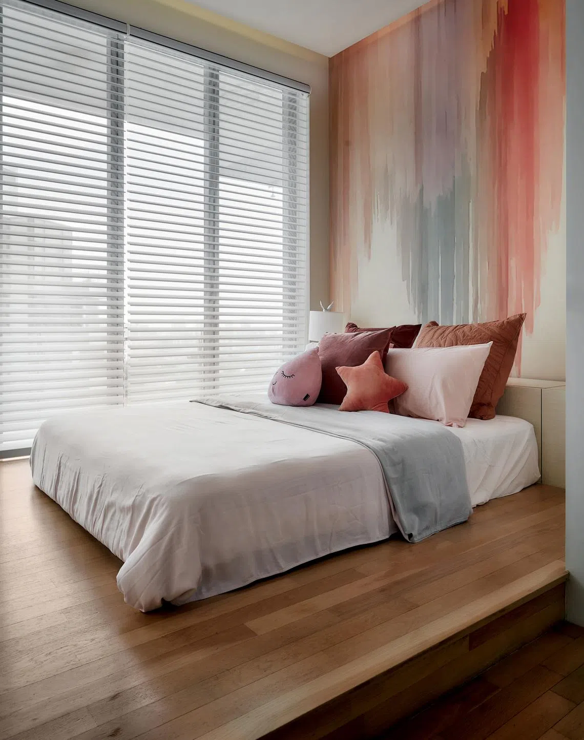 The daughter’s bedroom has a salmon-pink theme established by the abstract wall covering behind the bed. Elevated on a platform, the bed can be moved to one side to create more room for play. There is built-in storage in the bedhead, plus wall-to-wall wardrobes for clothes and toy storage.