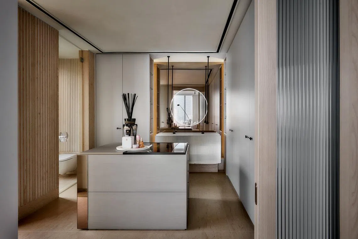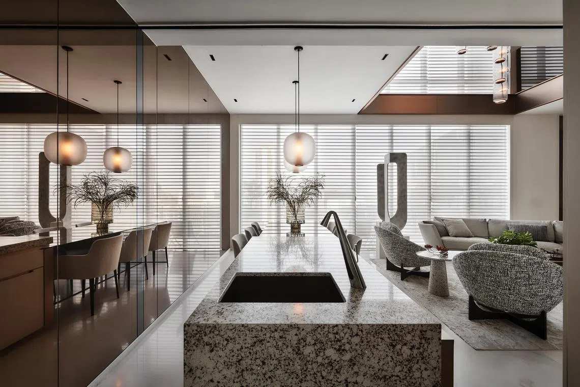 Mr Kuswandi also added a kitchen island that extends into a dining table. Echoing this long, linear element is a mirrored wall that extends across the kitchen and dining spaces, reflecting the view of the city beyond the floor-to-ceiling windows leading to the balcony.