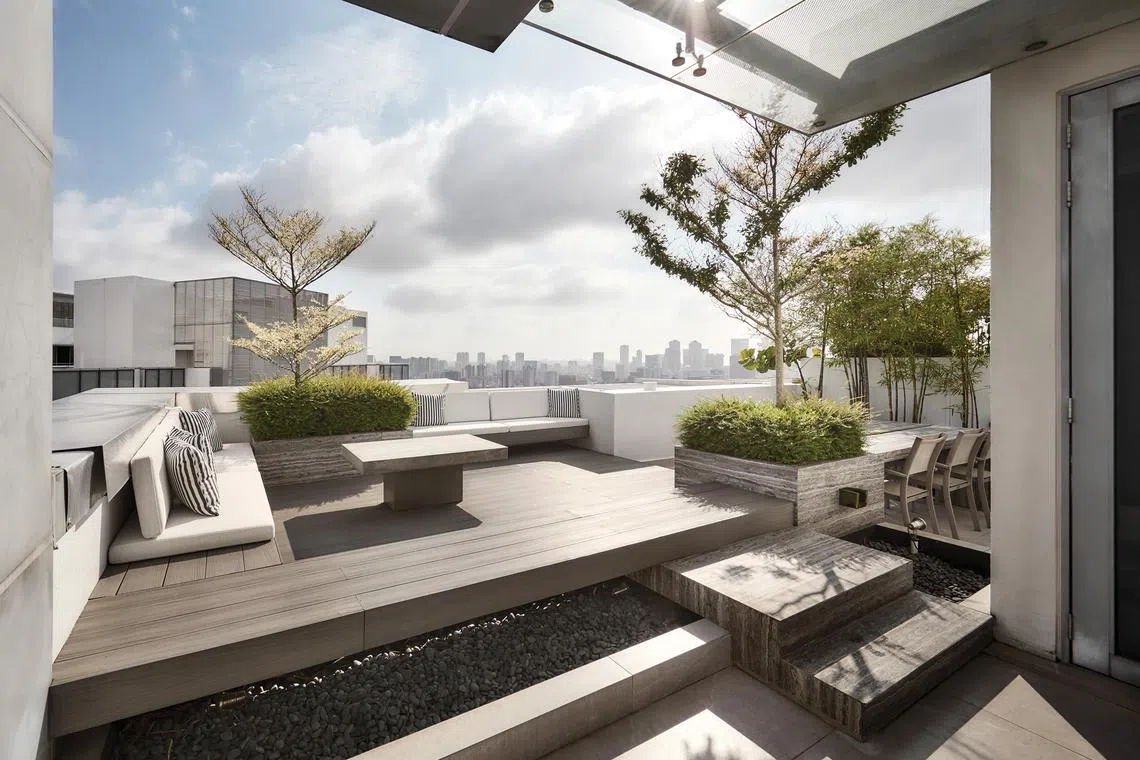 Outside, the roof terrace offers a view of the Cairnhill area all the way to Marina Bay. Mr Kuswandi raised the platform and built in an L-shaped sofa bench, with the tiered design and steps adding interest to the otherwise flat terrace.