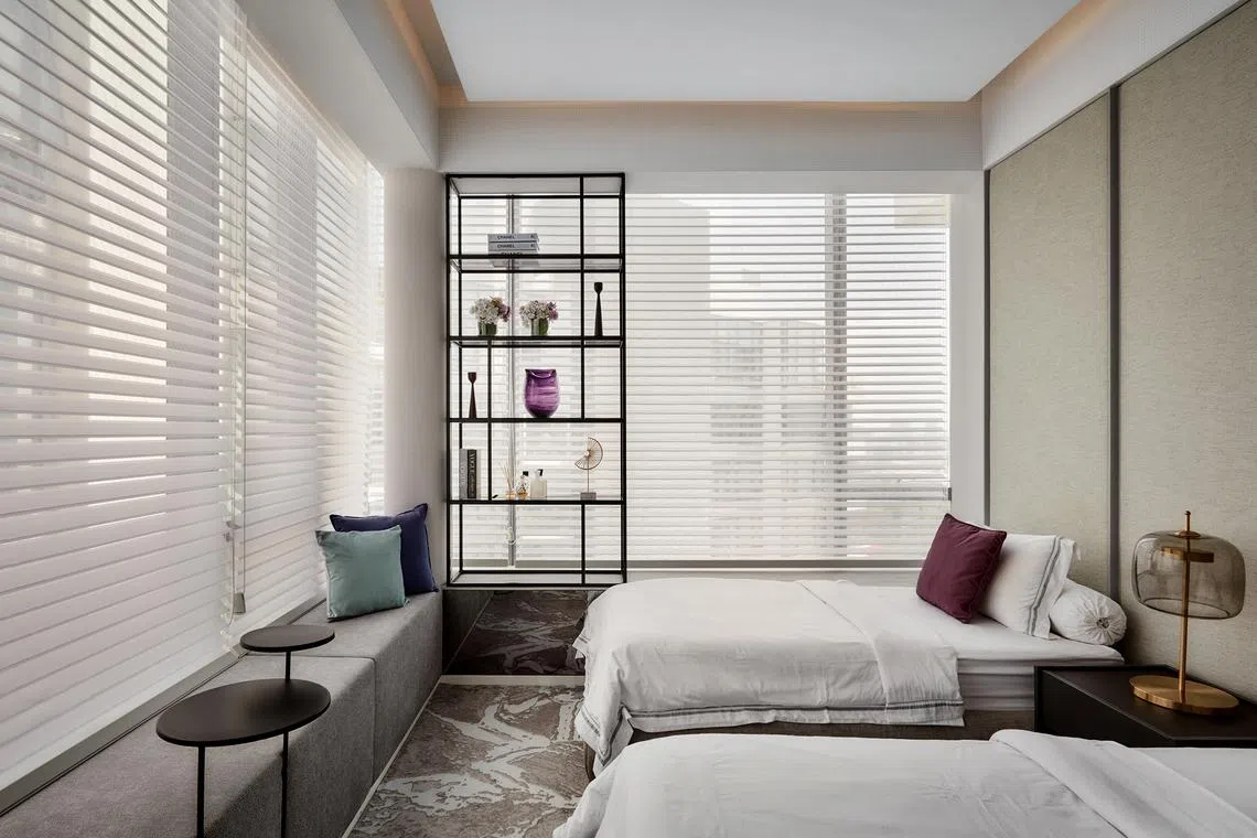A pastel green and grey palette sets the guest room apart. Two single beds accommodate the couple’s parents or siblings when they stay over. One side of the room’s L-shaped bay window is a settee overlooking the city, while the other is a combination of a shelving unit and a ledge for hand luggage.