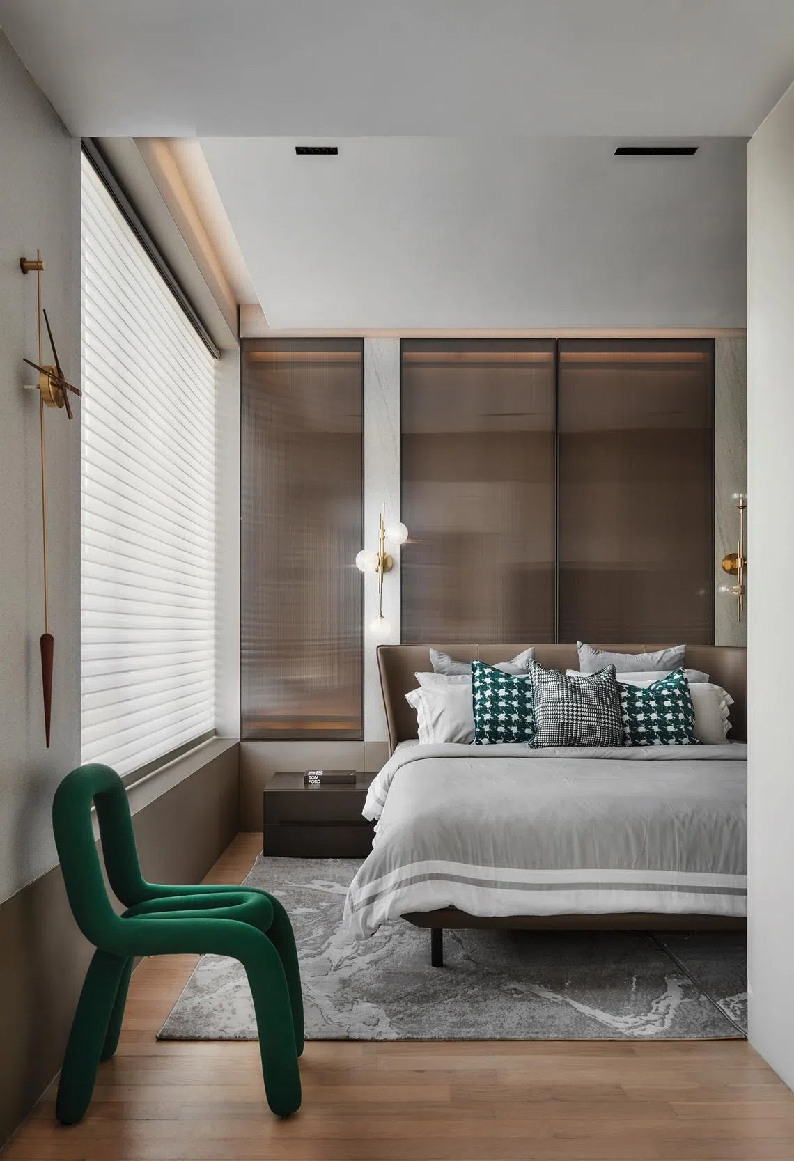 On the second storey, the master bedroom exudes a tranquil ambience with its light neutral palette. The headboard wall features bleached oak panelling with blown molecule glass that injects dynamism into the space, as it appears to glide across the wall.