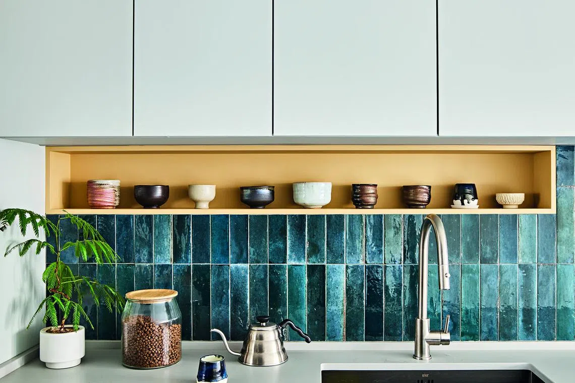 The navy-blue subway tiles on the backsplash were inspired by the owner’s love for the ocean and diving. These and the mustard backing for the drawers add a splash of colour to the area.