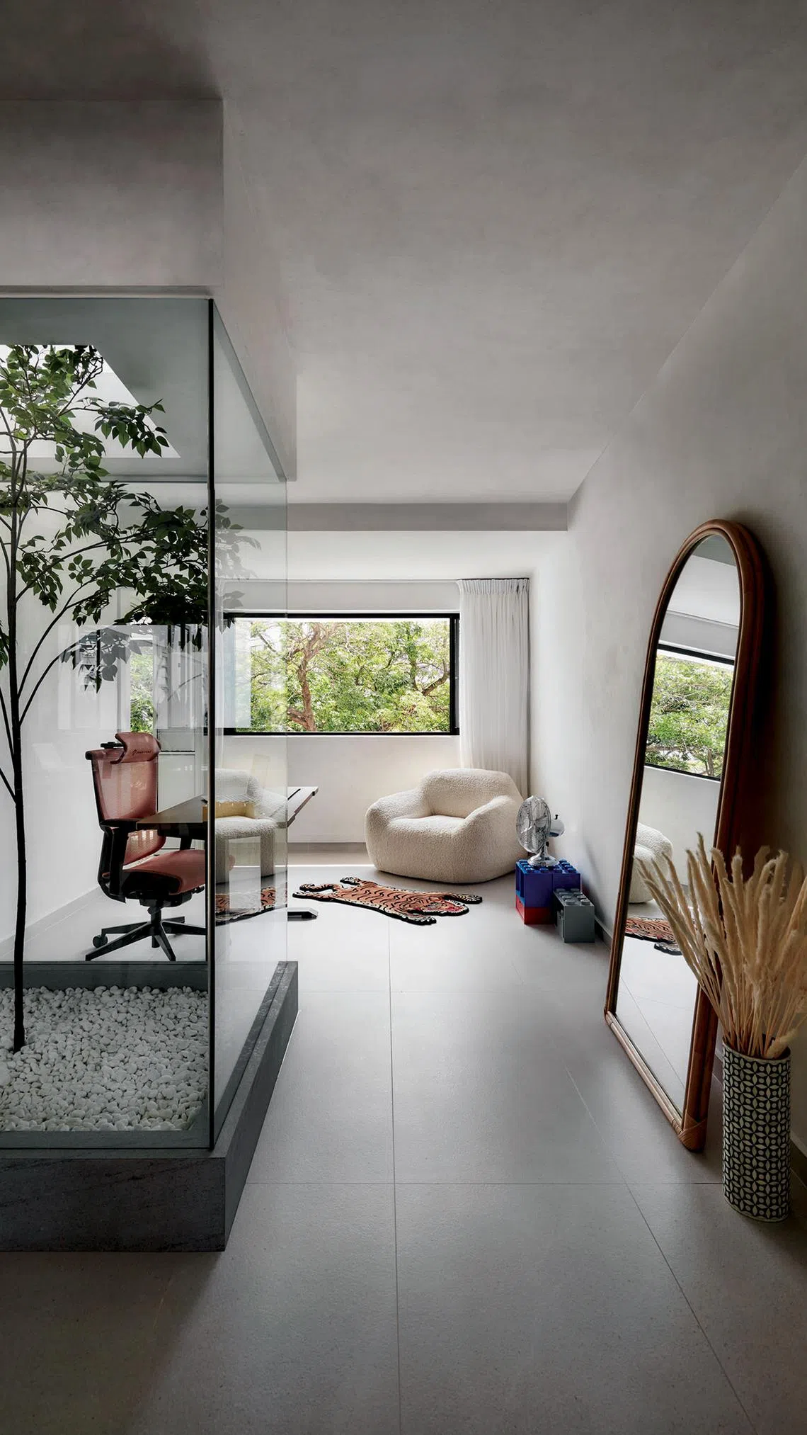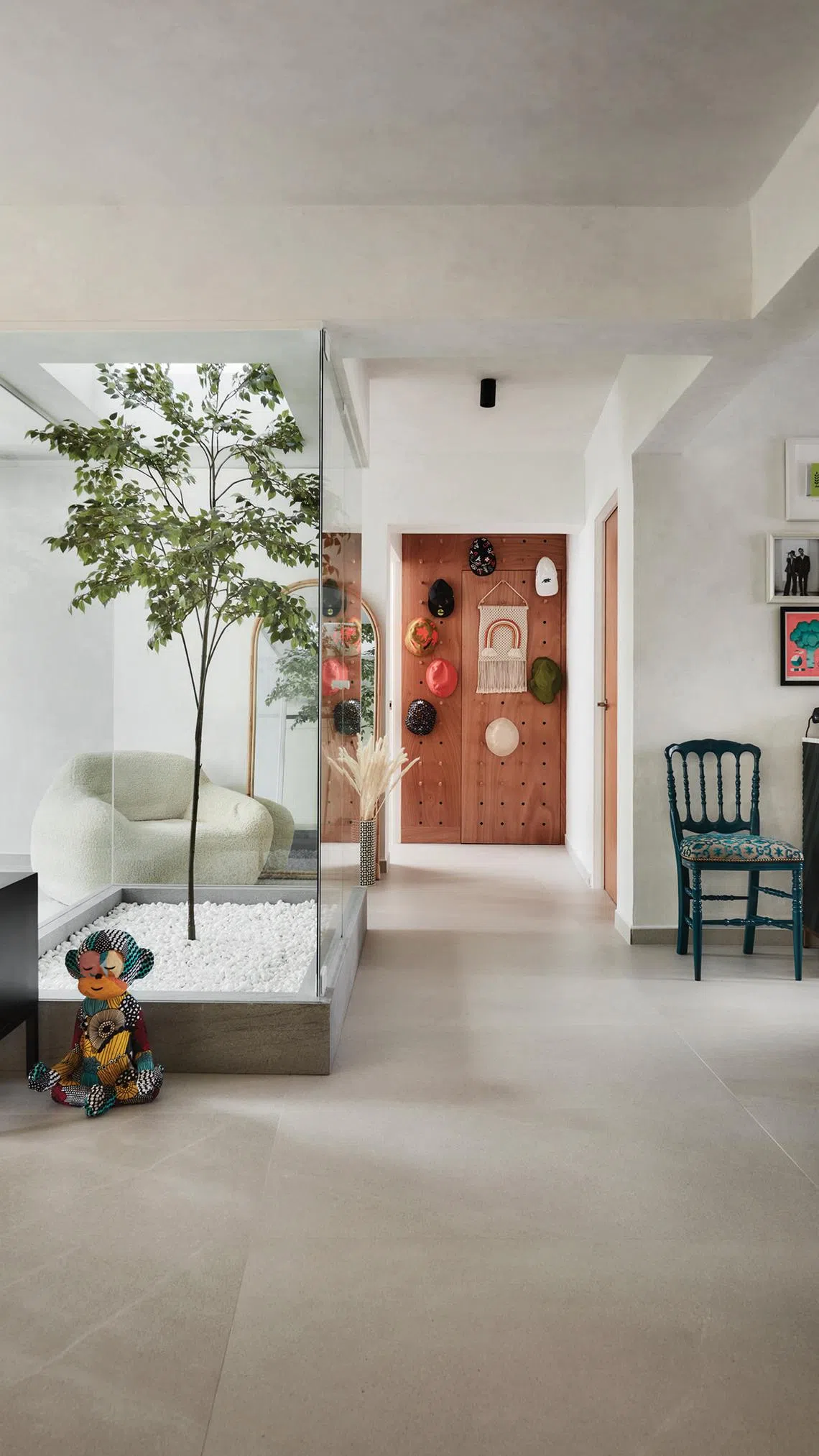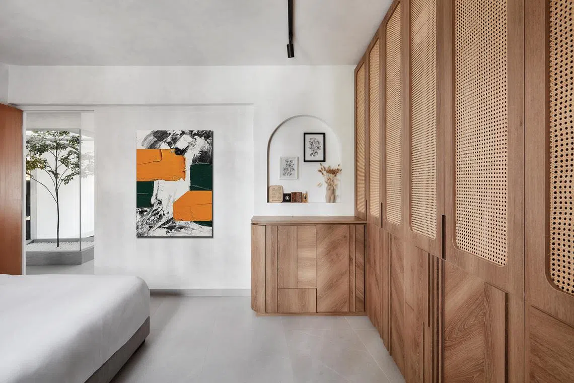 “As a Peranakan, colours are very important to me. I like vibrant colours and loud, exciting spaces. However, they can be overwhelming, so I incorporated relaxing hues such as limewashed walls and ceiling, neutral light grey floor tiles, and wood and rattan wardrobes,” she says.