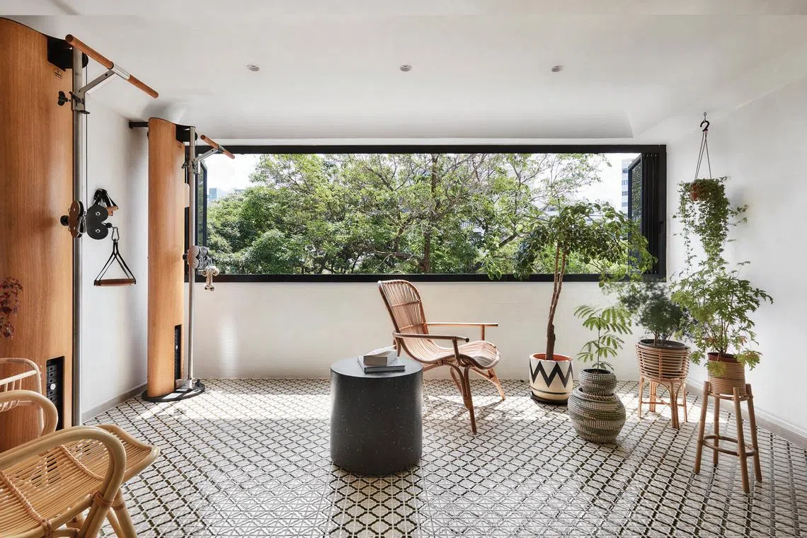 The space also houses a gym, with equipment in a wood casing that complements the cane furniture on the balcony.
