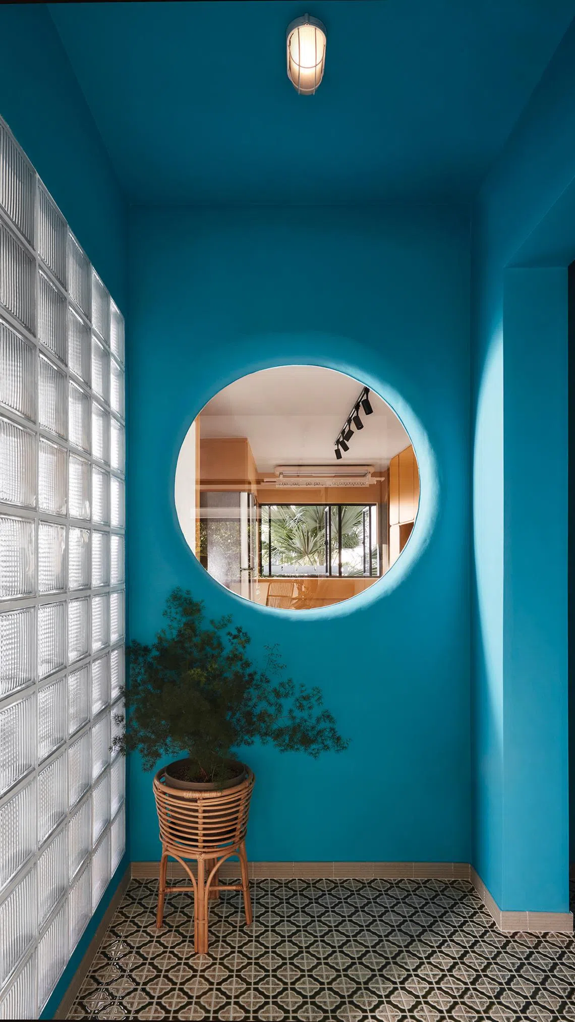 The entrance foyer creates an impact from the get-go with floral Peranakan tiles and a pop of blue on the walls. Glass blocks screen off the interior of the home, which Ms Lim shares with her 34-year-old husband Renda Teen, a digital marketing specialist.