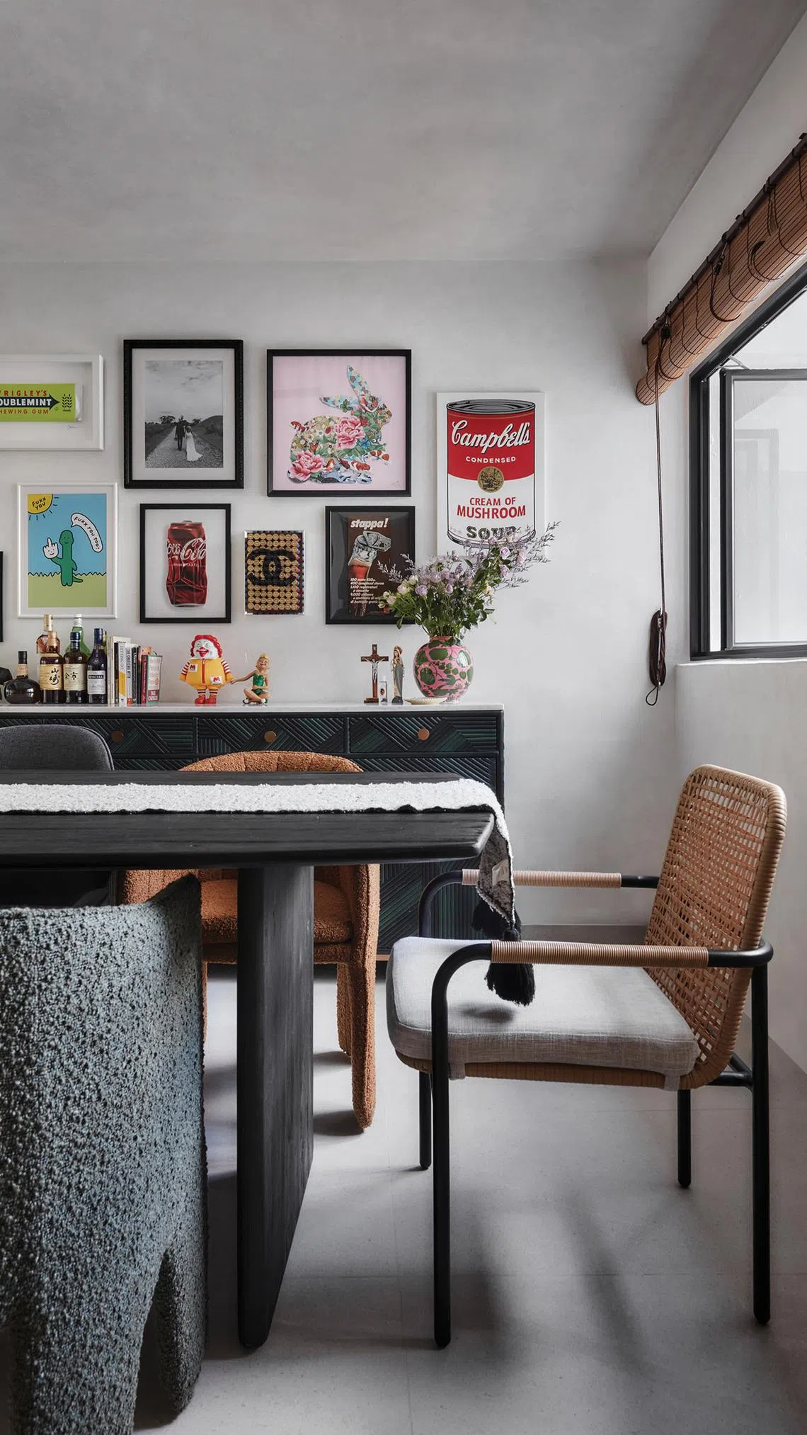A customised dark green sideboard cabinet from ipse ipsa ipsum reflects this ethos with its vegetable-dyed bamboo that produces an irregular green tone. On the walls is an eclectic mix of art in a colourful retro style.