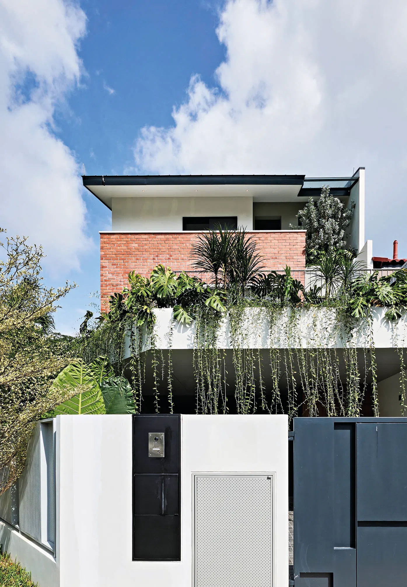 Planter boxes on the facade and second-storey outdoor terrace add a touch of greenery, with cascading vines that form a “veil” to screen spaces off.